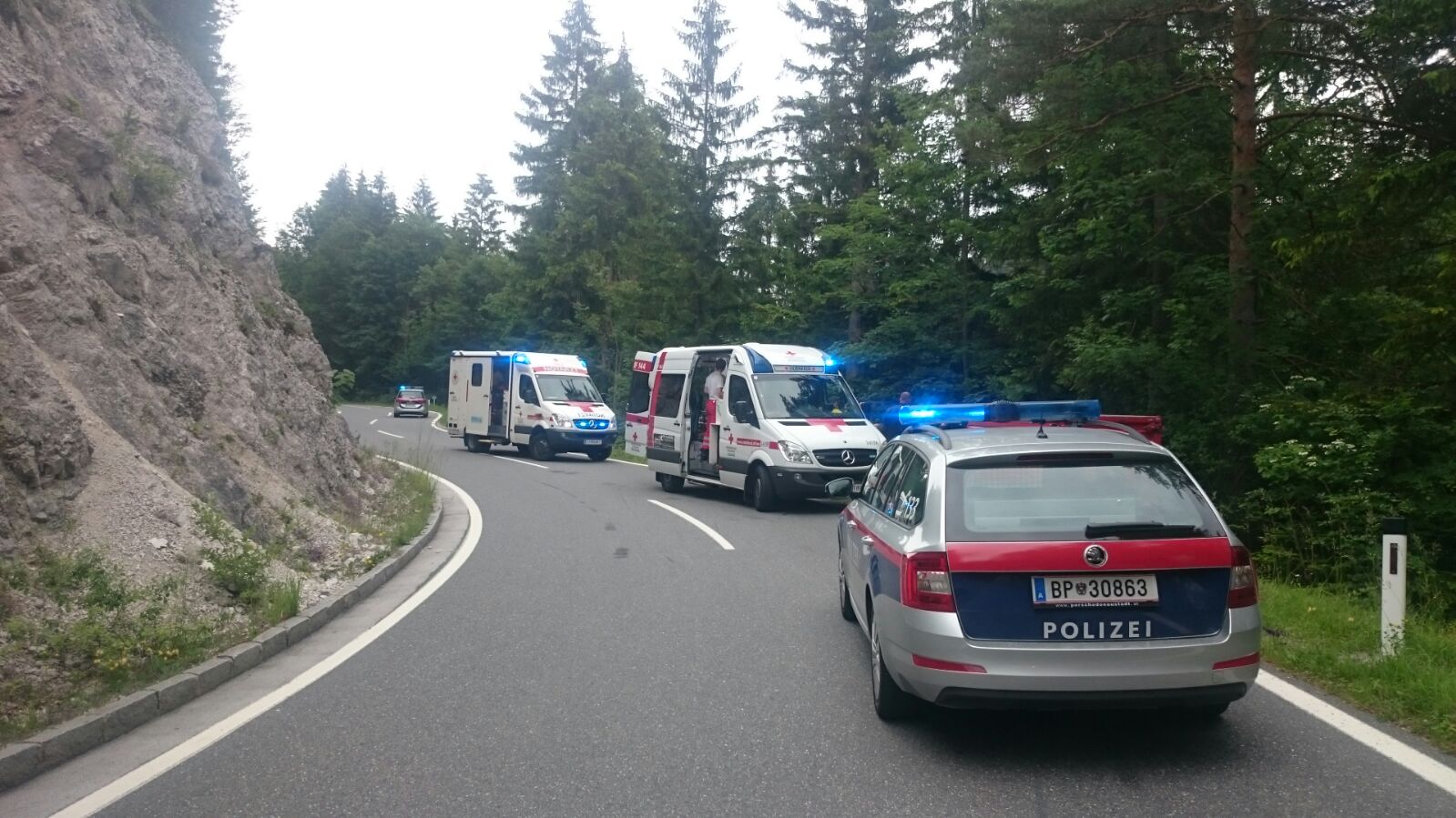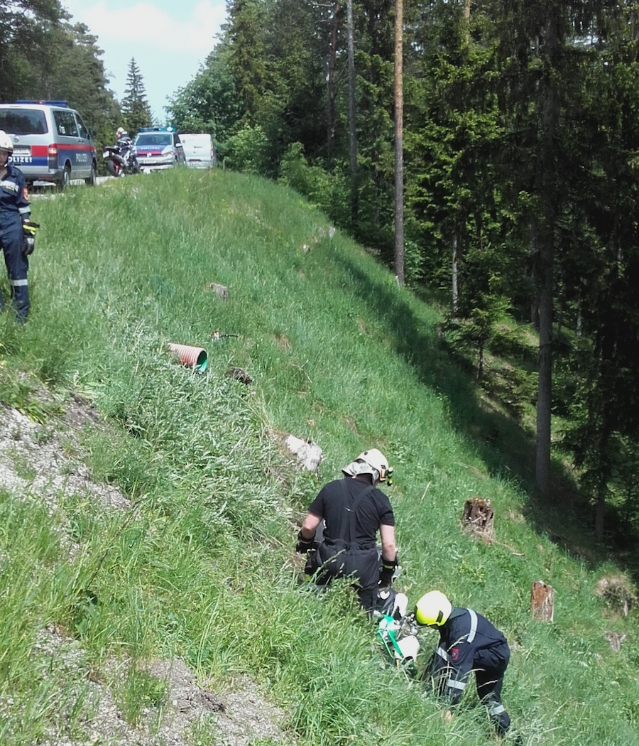 Bei Kilometer 61,2 rutschte einem Lenker aus ungeklärter Ursache das Vorderrad weg und er kam zu Sturz. Der nachfolgenden Lenkerin misslang auf Grund eines entgegenkommenden PKW das Ausweichmanöver und sie stürzte ebenfalls. Ihr Zweirad rutschte von der Straße und stürzte ca. 15 Meter ab.