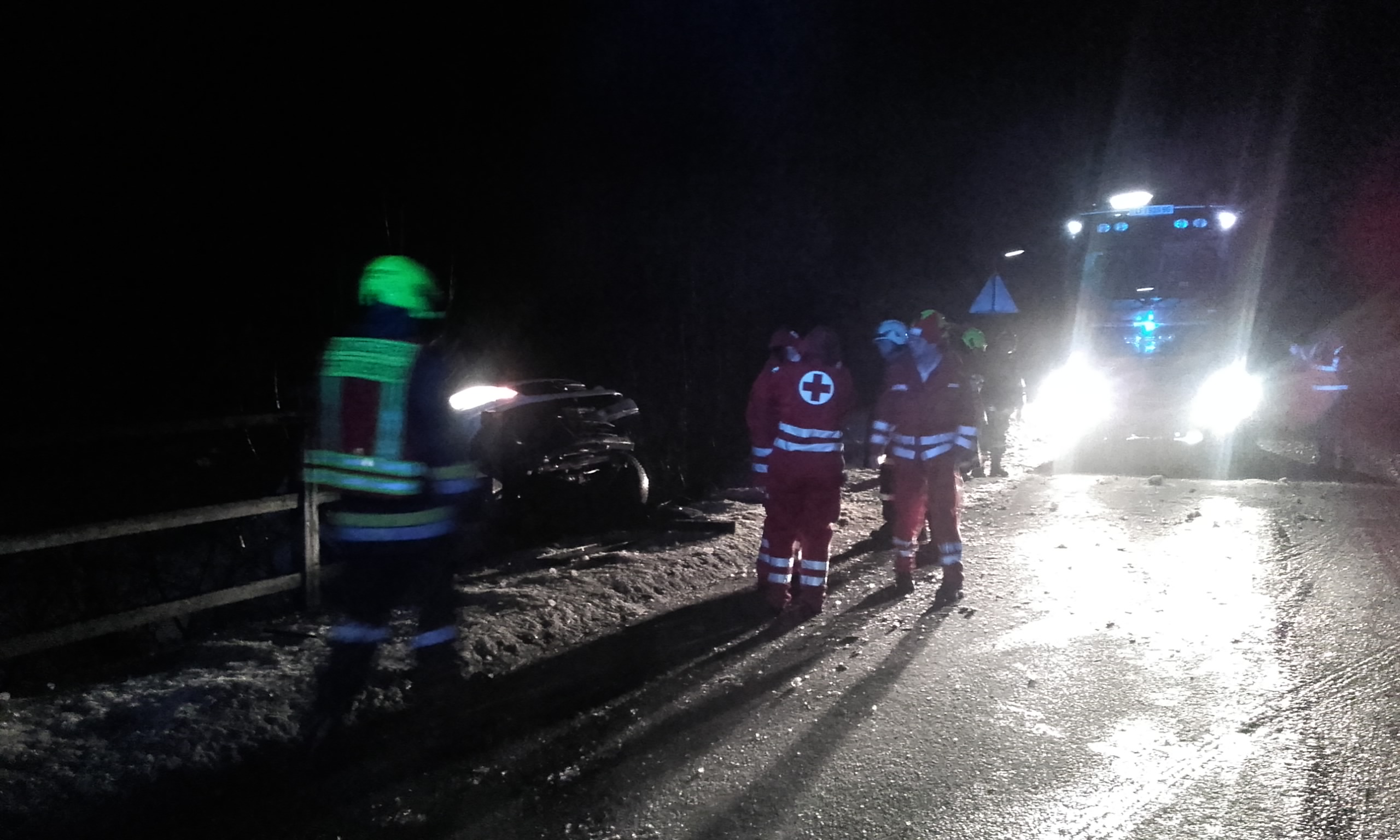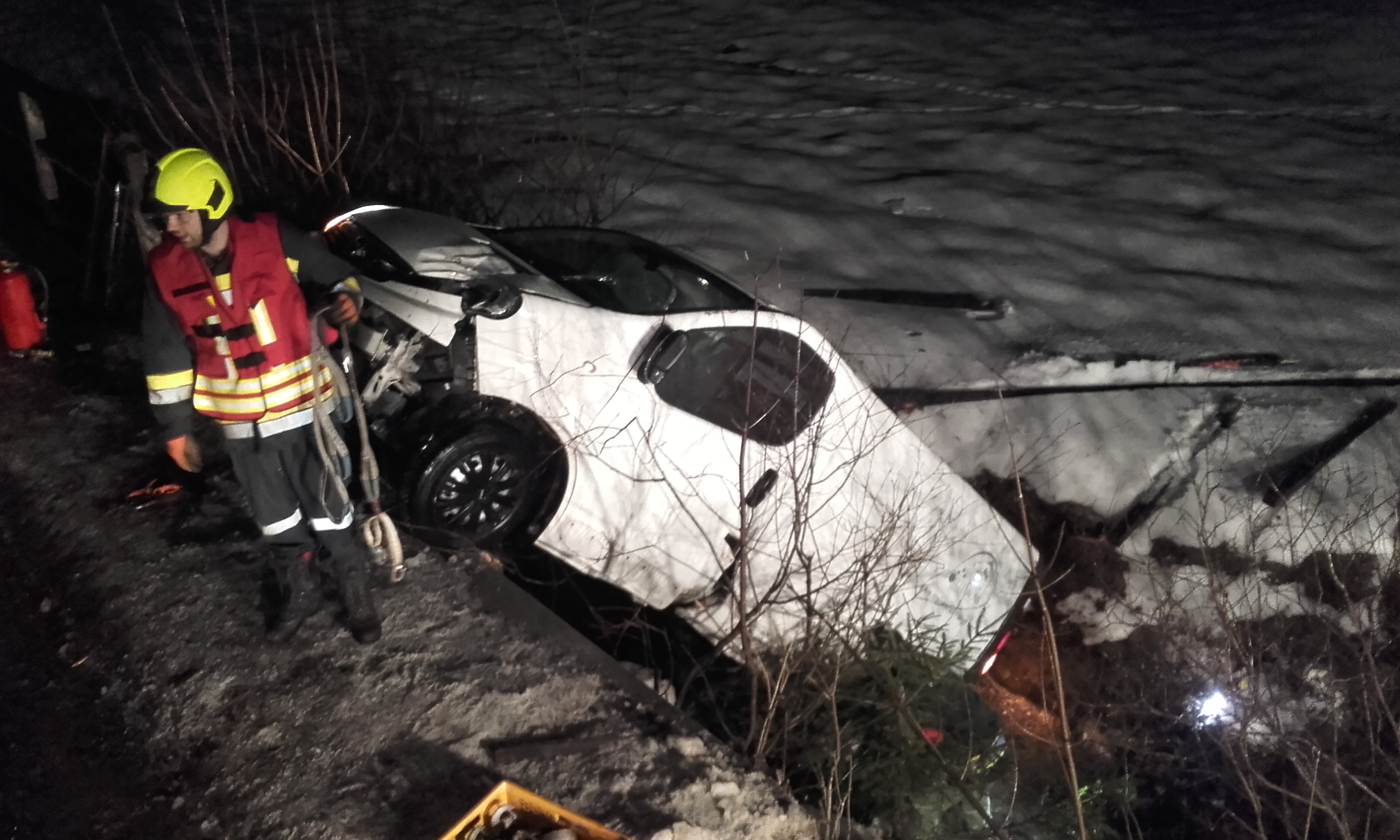 Umgehend nach dem Eintreffen wurde die Unfallstelle abgesichert und der VF-K der FF Hohenberg nachgefordert. Mittels RLF-A Seilwinde wurde das Fahrzeug gegen weiteres Abrutschen gesichert. Die Besatzung des TLF-A leuchtete einstweilen mittels Lichtmast und Umfeldbeleuchtung die Einsatzstelle aus.