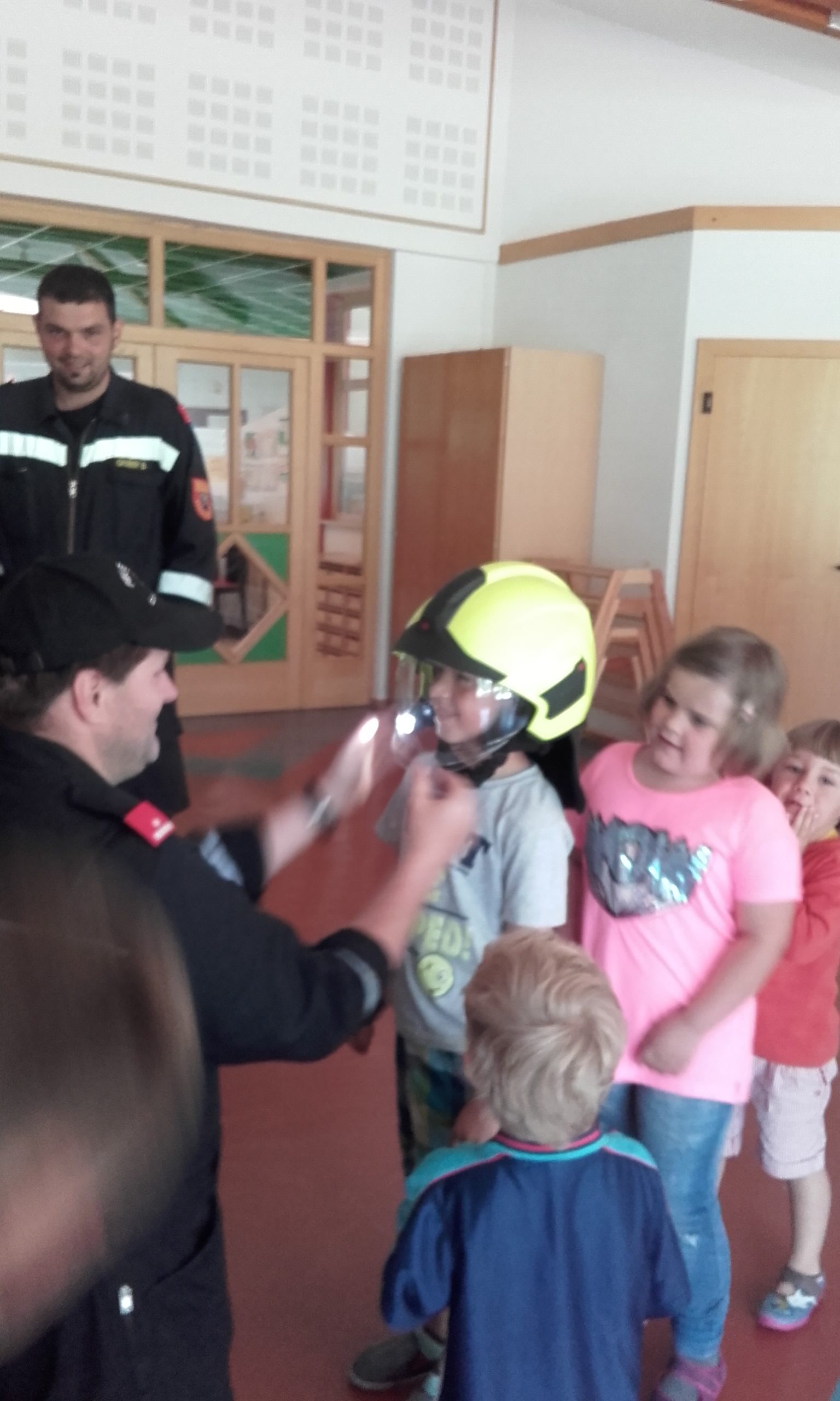 Pünktlich um 9:30Uhr startete das Programm mit „Brandschutzerziehung für die Kleinsten“: Was macht die Feuerwehr, wie lautet die Notrufnummer der Feuerwehr, Wie verhalte ich mich im Brandfall uvm….Die Kids arbeiteten sehr eifrig mit da sie von den Pädagoginnen und Betreuerinnen schon bestens auf den Besuch vorbereitet wurden.