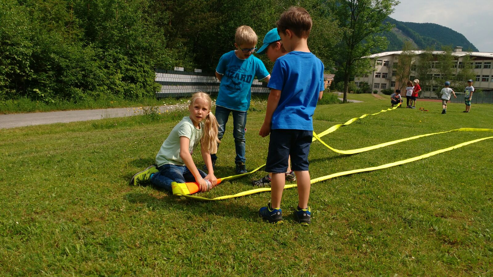Danach ging`s raus, auf den im Ernstfall zu verwendenden Sammelplatz, beim Hartplatz der neuen Mittelschule. Im Anschluß gab es Stationsbetrieb: die beiden Gruppen wurden wieder geteilt, eine Gruppe meisterte die Jugendbewerbsbahn die andere Gruppe durfte TLF-A 4000 und RLF-A 2000 genauestens unter die Lupe nehmen und mit dem HD- Rohr selbst hantieren. Zum Abschluss durfte jedes Kind eine Runde mit dem „großen Feuerwehrauto“ mitfahren.