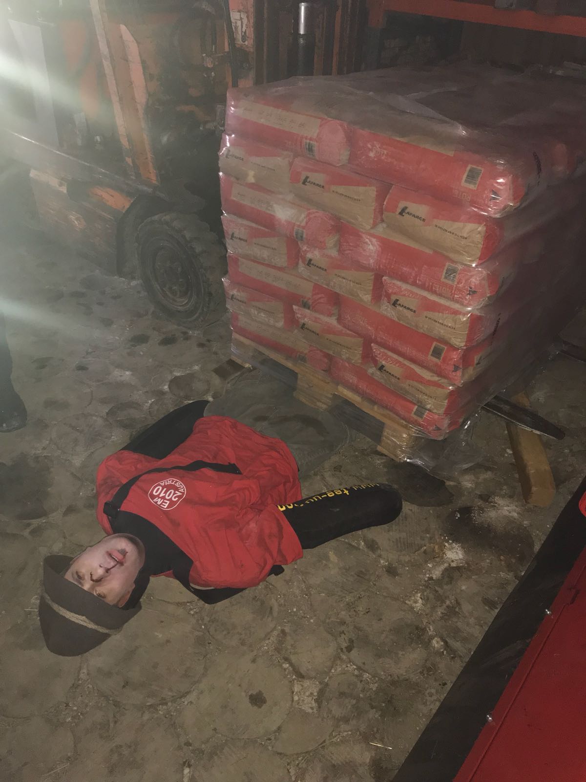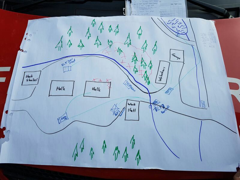 Übungsannahme war ein durch 2 zündelnde Kinder entfachter Waldbrand in der Nähe einer Maschinenhalle bzw. Wohnhaus. Der Brand breitete sich innerhalb kürzester Zeit auch auf die Halle aus. Beim Versuch die Halle auszuräumen kam er Gutsverwalter zu Sturz und wurde unter einer Palette eingeklemmt. Auch die beiden Kinder waren nicht mehr aufzufinden und mussten parallel dazu gesucht werden.