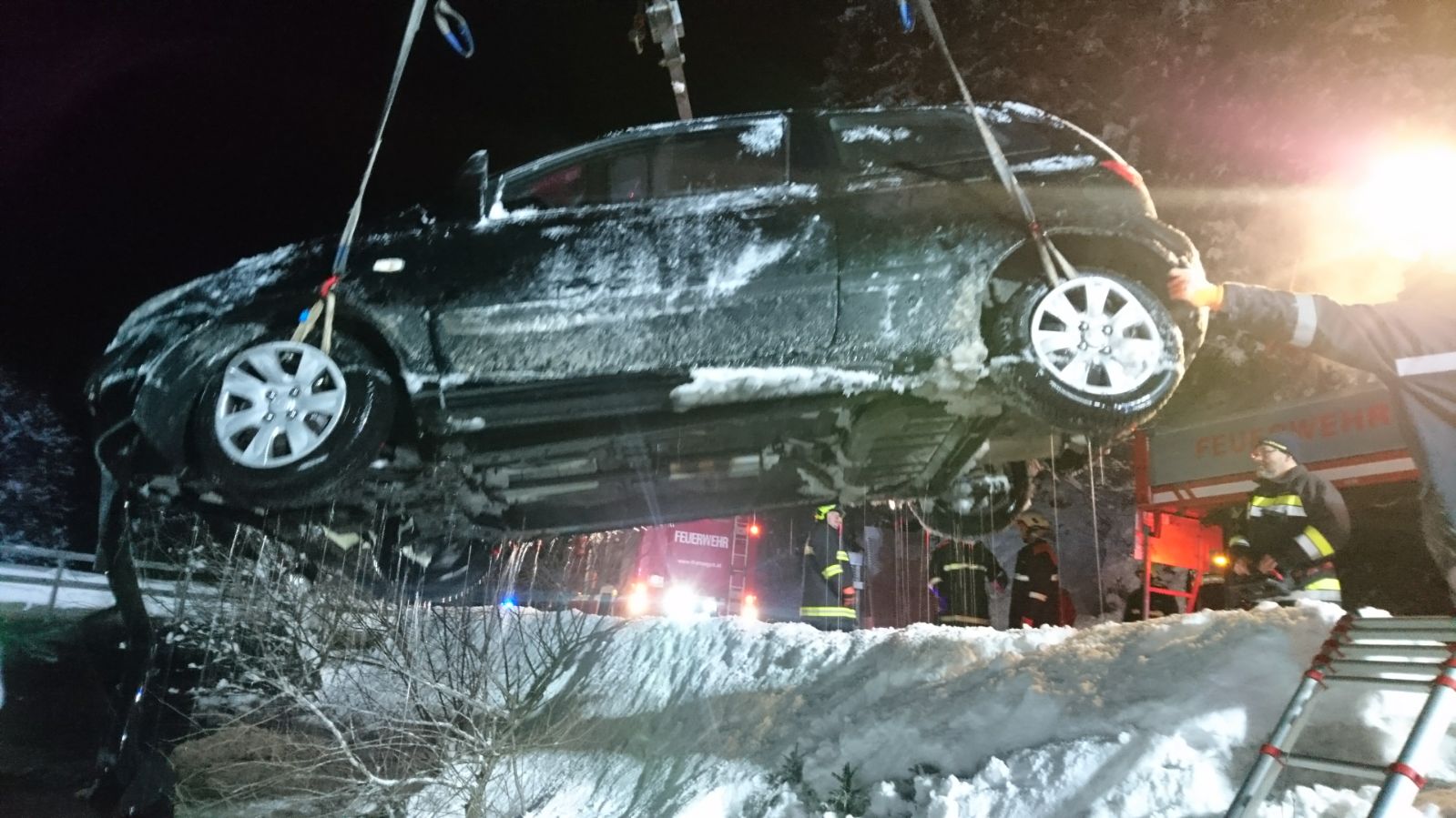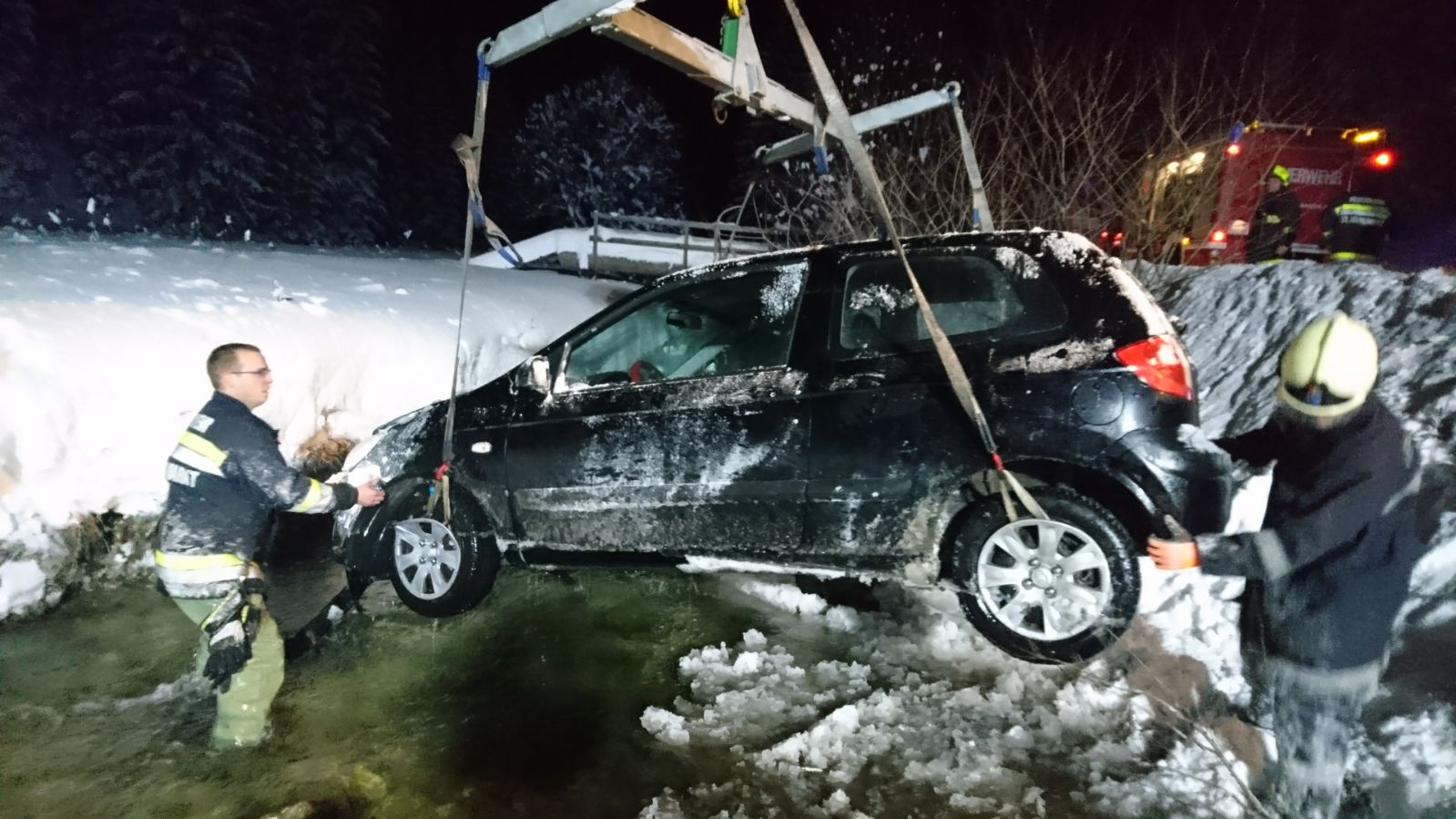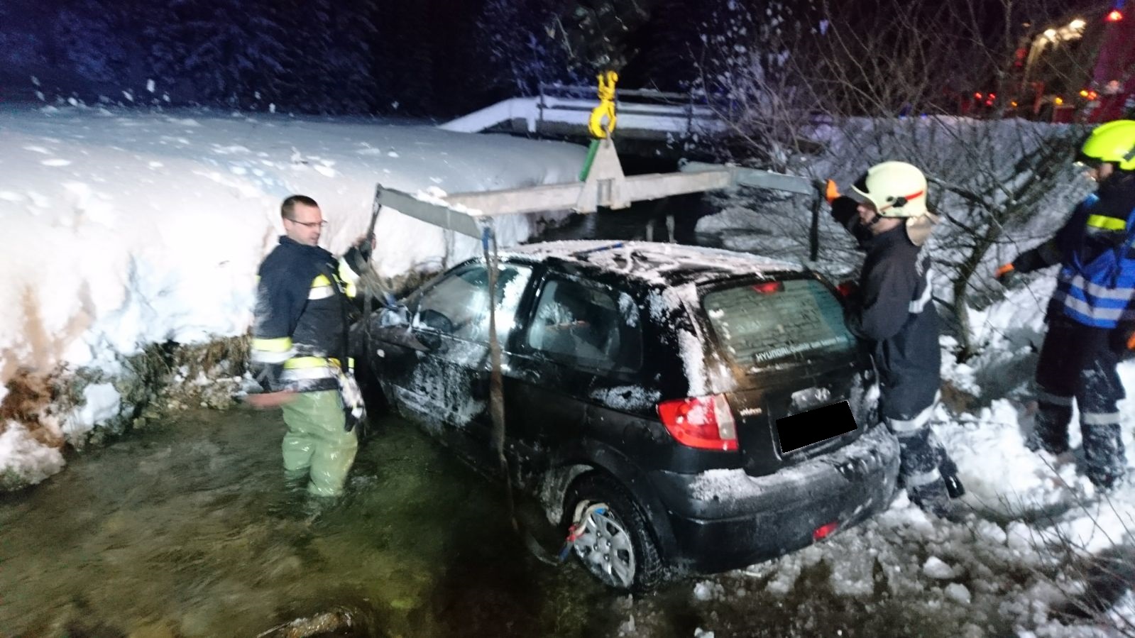 Das beschädigte Fahrzeug wurde mittels Kran aus dem Bach gehoben, auf den Abschleppanhänger verladen und von der Unfallstelle verbracht.