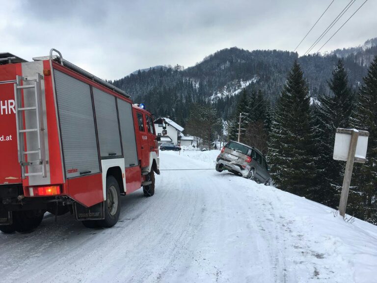 Ein Lenker aus dem Bezirk Scheibbs war mit seinem PKW am Mittwoch Vormittag auf der L101 Fahrtrichtung Gscheid unterwegs. In einer Linkskurve in Ulreichsberg wich er einem entgegenkommenden PKW aus. Beim Ausweichmanöver kam er von der schneeglatten Fahrbahn ab und rutschte über eine steile Böschung. Die FF St Aegyd Markt rückte mit RLFA zu diesem Einsatz aus. Mithilfe der RLFA-Seilwinde wurde der verunfallte PKW aus dem Graben geborgen. Da am Fahrzeug kein Schaden entstand konnte der Lenker seine Fahrt im Anschluss fortsetzen.