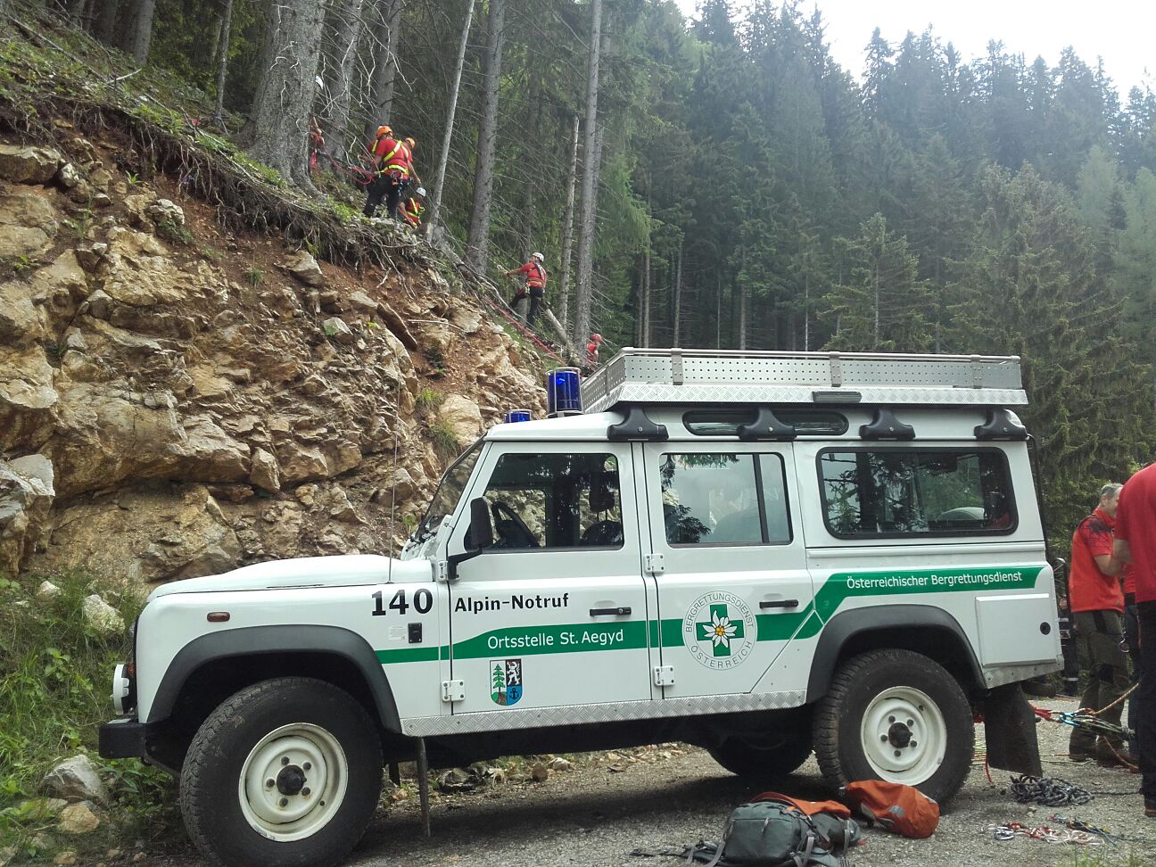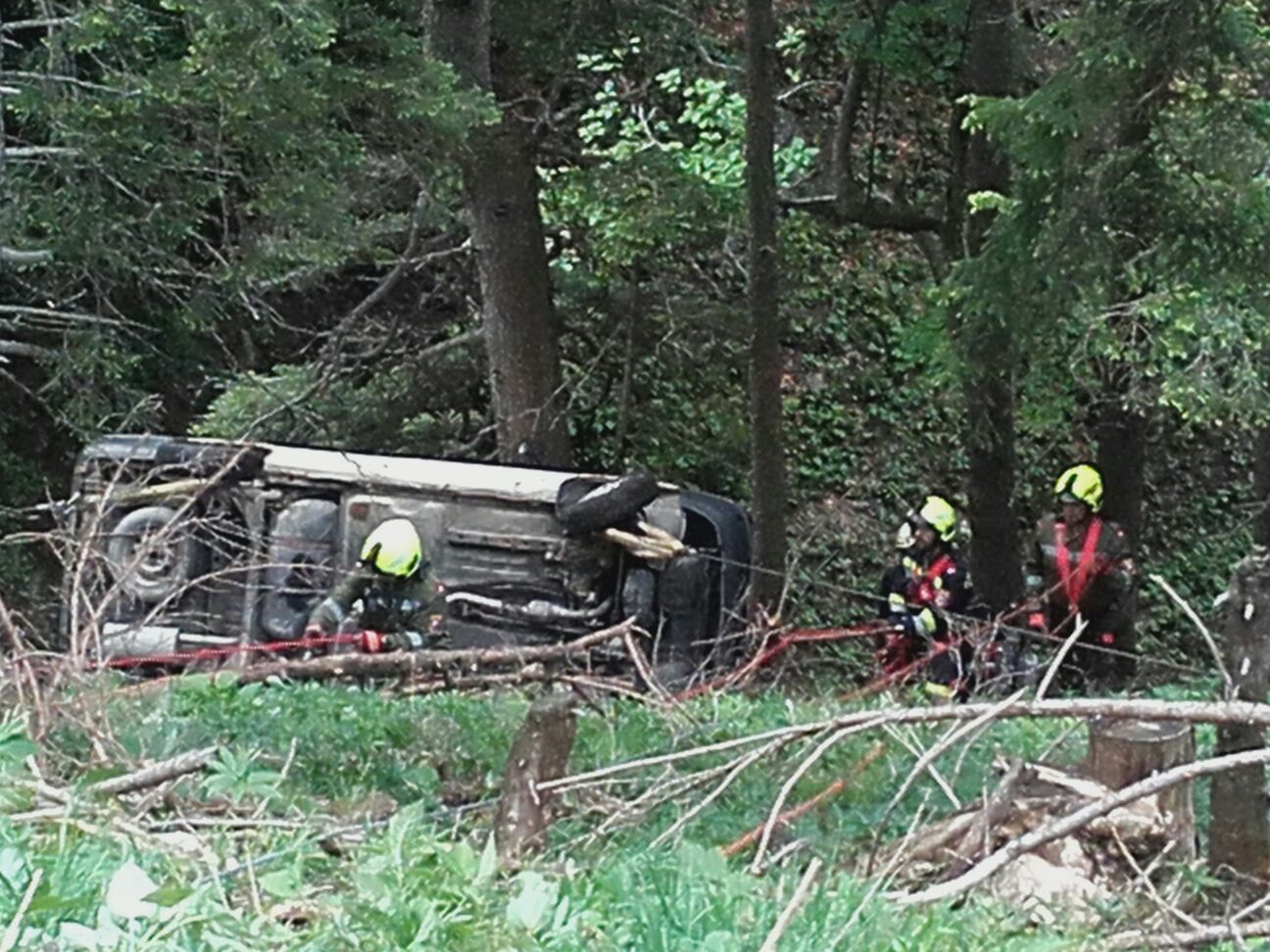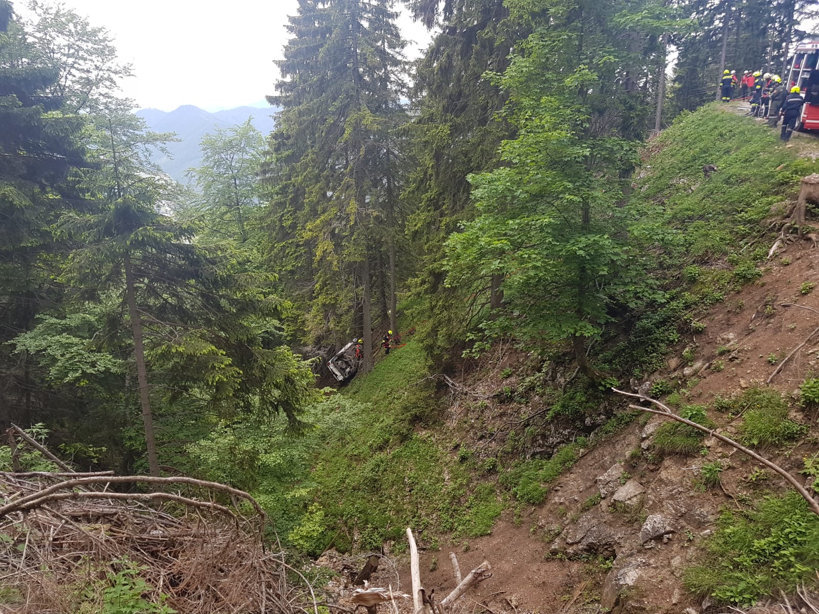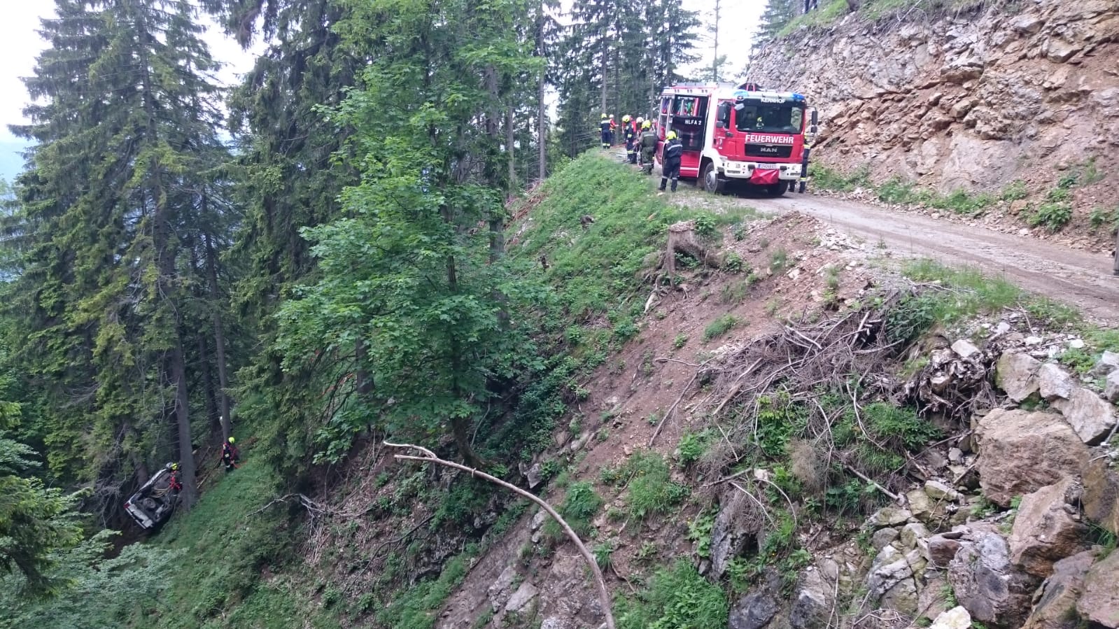 Arbeiter die diesen Unfall gesehen haben, fuhren mit ihrem PKW talwärts und kamen selbst von der Straße ab. Der PKW kam rund 60 m unterhalb der Straße zum Stillstand. Zwei der im Fahrzeug befindlichen Personen wurden aus dem Fahrzeug geschleudert, der PKW Lenker wurde  im verunfalltem Fahrzeug eingeklemmt. Eine der Personen blieb nach dem Überschlag unverletzt, wollte zu Fuß Hilfe holen, stürzte jedoch unglücklich und blieb verletzt im Wald liegen.