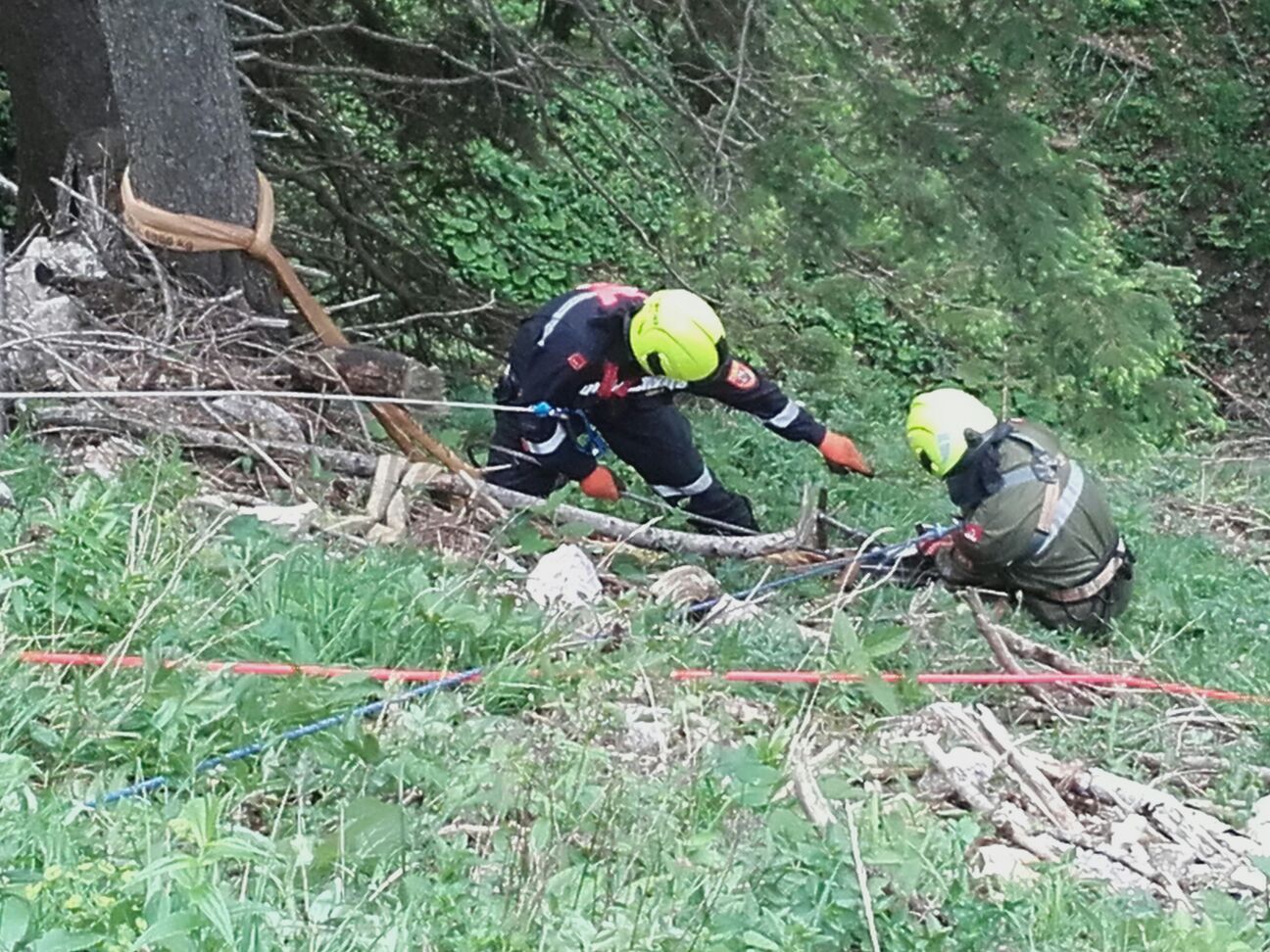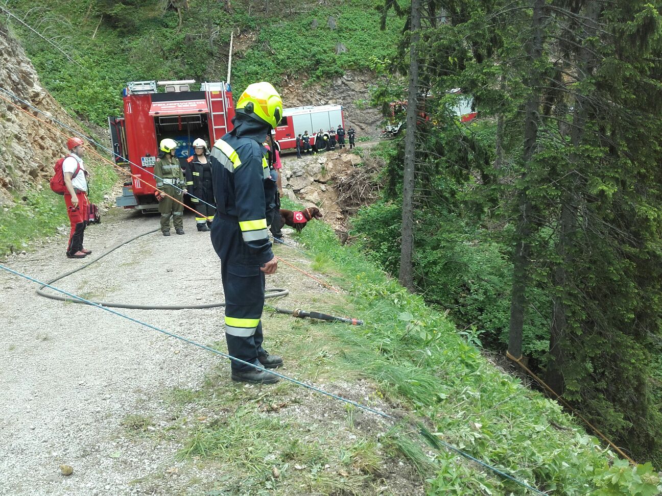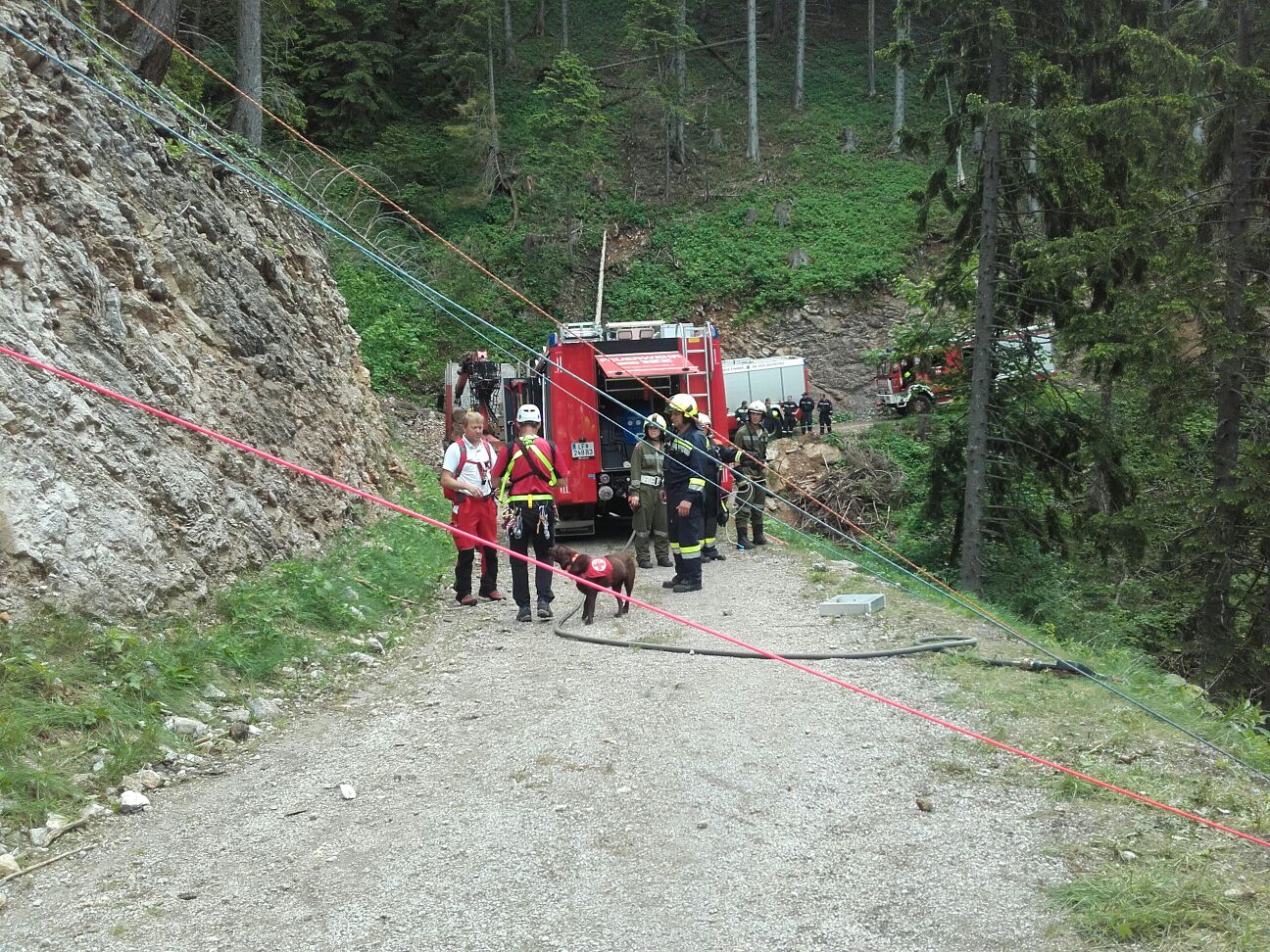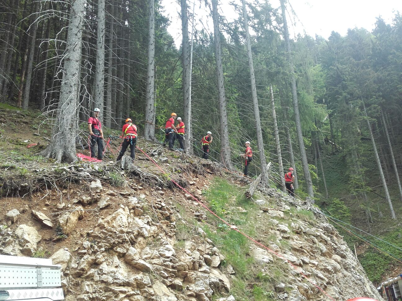 Arbeiter die diesen Unfall gesehen haben, fuhren mit ihrem PKW talwärts und kamen selbst von der Straße ab. Der PKW kam rund 60 m unterhalb der Straße zum Stillstand. Zwei der im Fahrzeug befindlichen Personen wurden aus dem Fahrzeug geschleudert, der PKW Lenker wurde  im verunfalltem Fahrzeug eingeklemmt. Eine der Personen blieb nach dem Überschlag unverletzt, wollte zu Fuß Hilfe holen, stürzte jedoch unglücklich und blieb verletzt im Wald liegen.