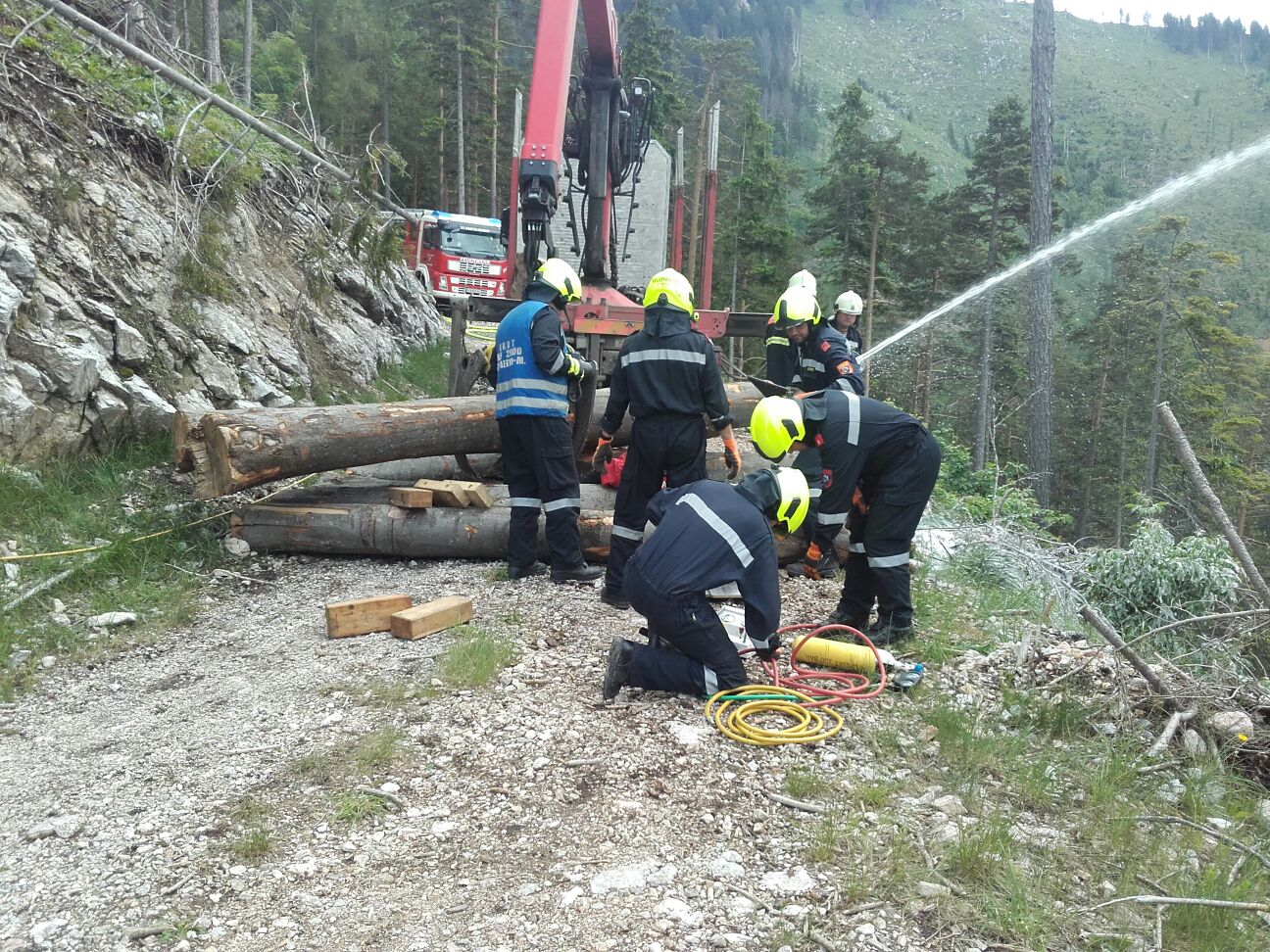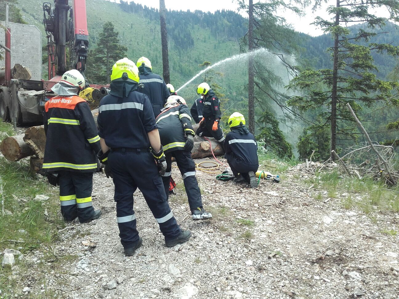 Ein Wanderer entdeckte einen Brand eines Holztransporters auf einer Forststrasse zwischen Gippel und Hofalm. Er alarmierte die Einsatzkräfte und eilte unverzüglich zur Unglücksstelle. Als dieser dort ankam, entdeckte er auch  eine Person die unter Baumstämmen eingeklemmt war.