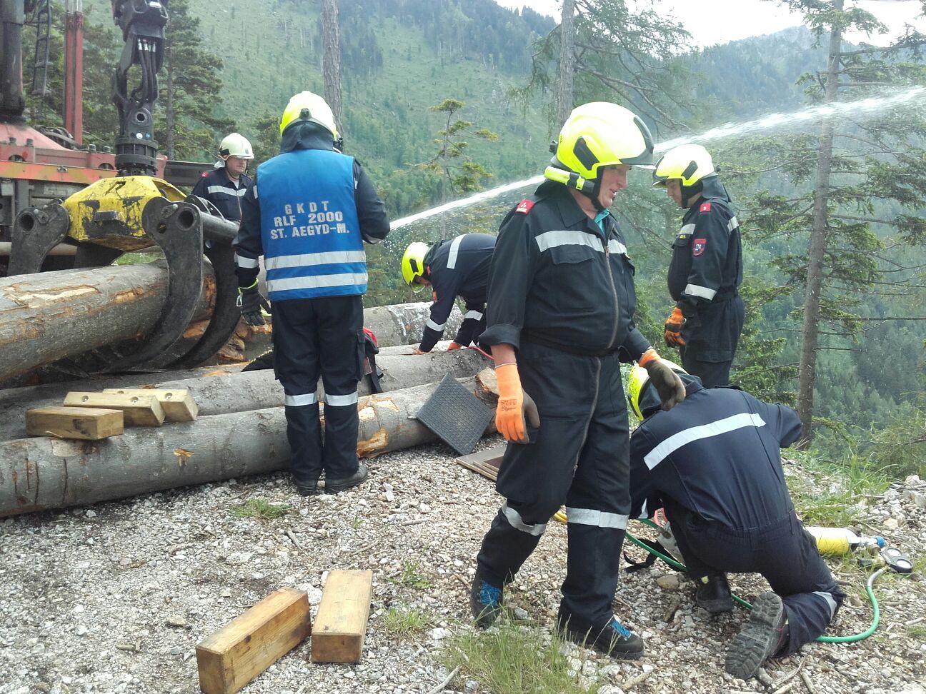Die FF St Aegyd rückte mit TLFA und RLFA zu dieser Übung aus. Bereits bei der Anfahrt ins Thalerl konnte man den Rauch des brennenden LKWs  oberhalb des Anwesens Reinthaler sehen. Da die FF Kernhof bereits über die Reinthalerstrasse unterwegs war, wurden wir von der Übungsleitung über die Hinterbichlerstrasse zum Übungsort gelotst. Nach der rund 30min langen Anfahrt wurde der rauchende LKW erreicht, nach der Erkundung wurde umgehend mit der Brandbekämpfung mittels TLFA-Schaumschnellangriffseinrichtung begonnen. Die eingeklemmte Person unter den Baumstämmen wurde mit Hilfe der Hebekissen von der Mannschaft des RLF-A befreit.