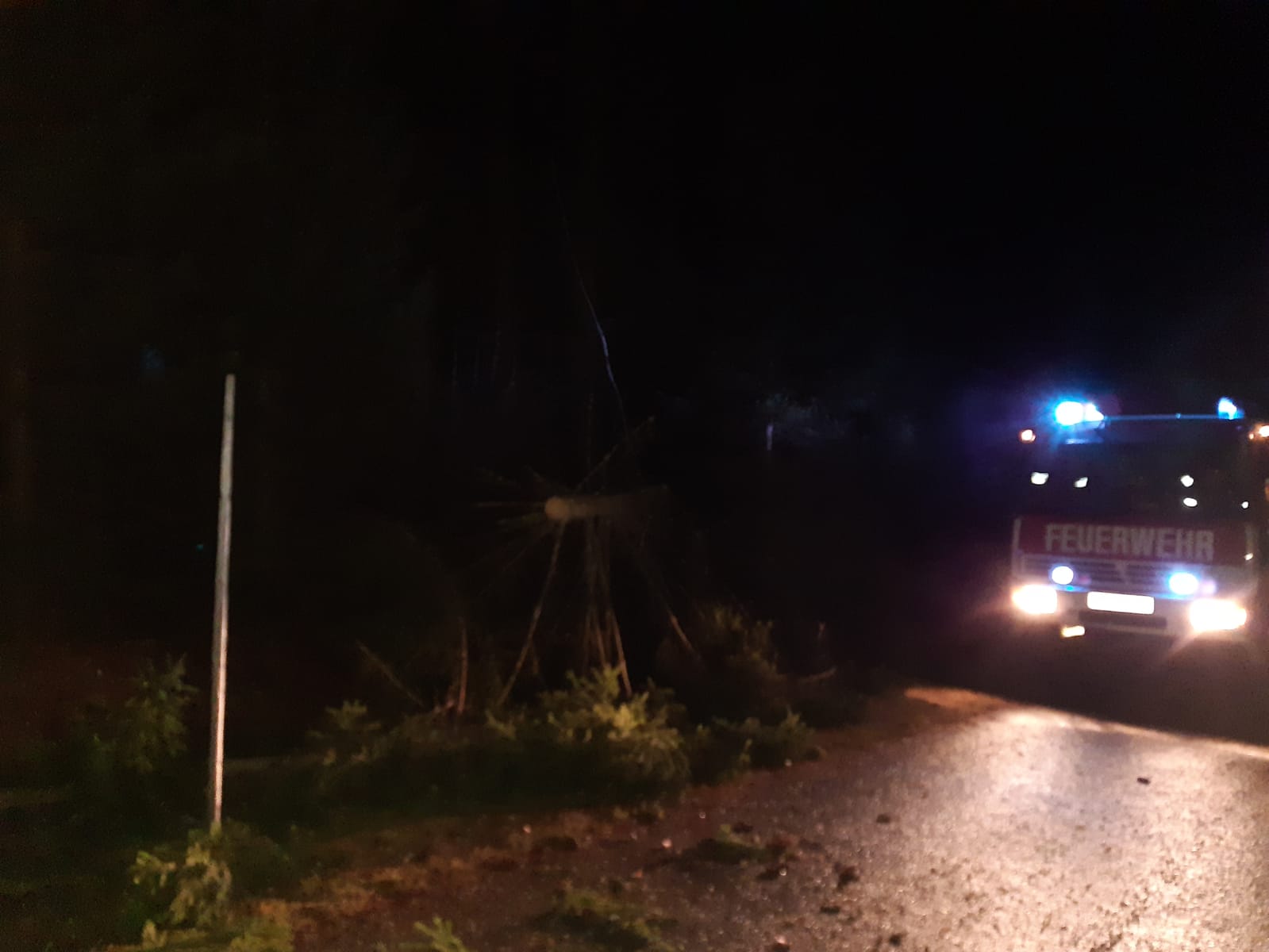 Starke Sturmböen entwurzelten einen Baum, welcher die Zufahrt zu einer Siedlung blockierte. Der Baum wurde mit der Motorsäge aufgearbeitet und händisch entfernt.