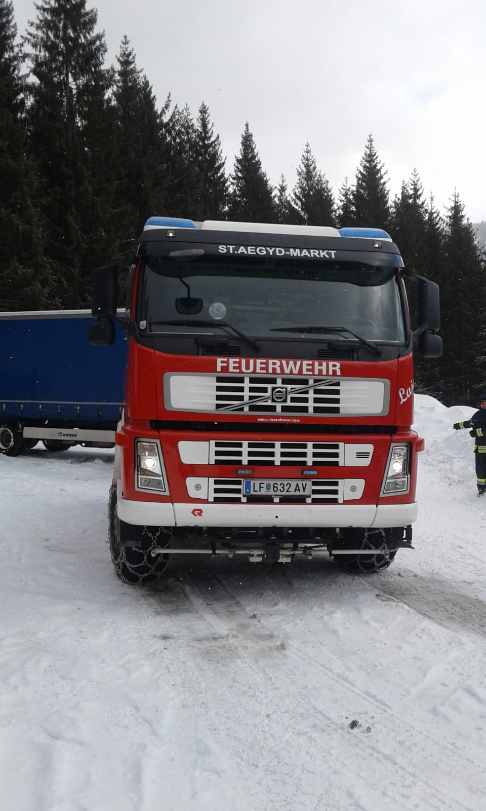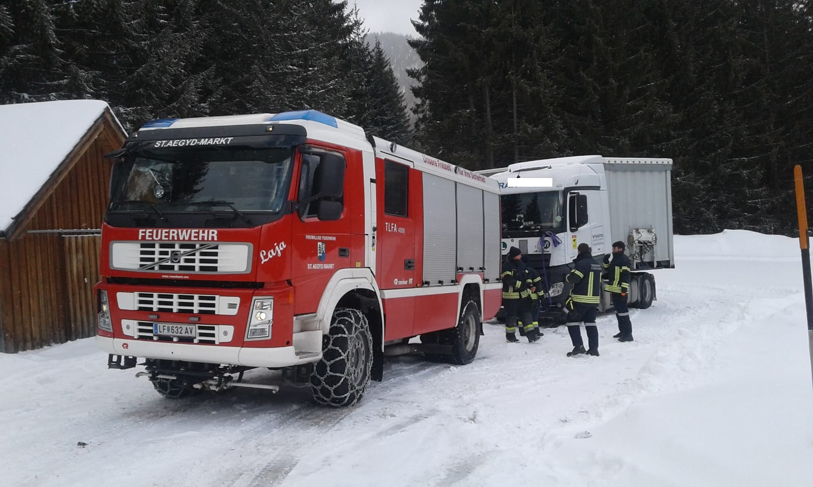 Ein ausländischer Lkw-Fahrer wollte aufgrund der winterlichen Fahrbahnverhältnisse wenden, scheiterte bei dem Manöver und blieb hängen. Der Sattelzug wurde mit der Schleppstange vom TLF auf die Straße gezogen und konnte seine Fahrt fortsetzen. Er führte keine Schneeketten mit.
