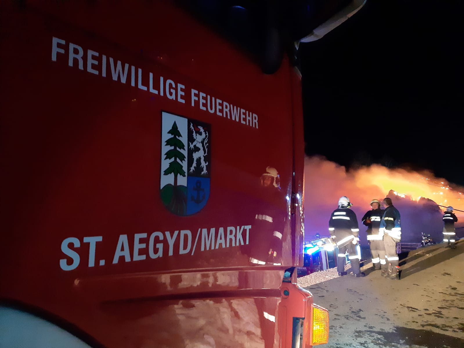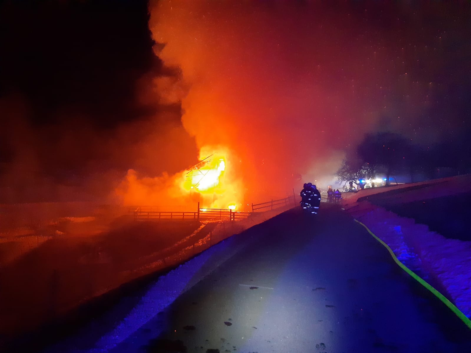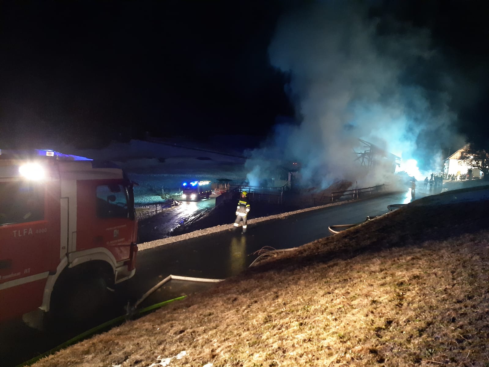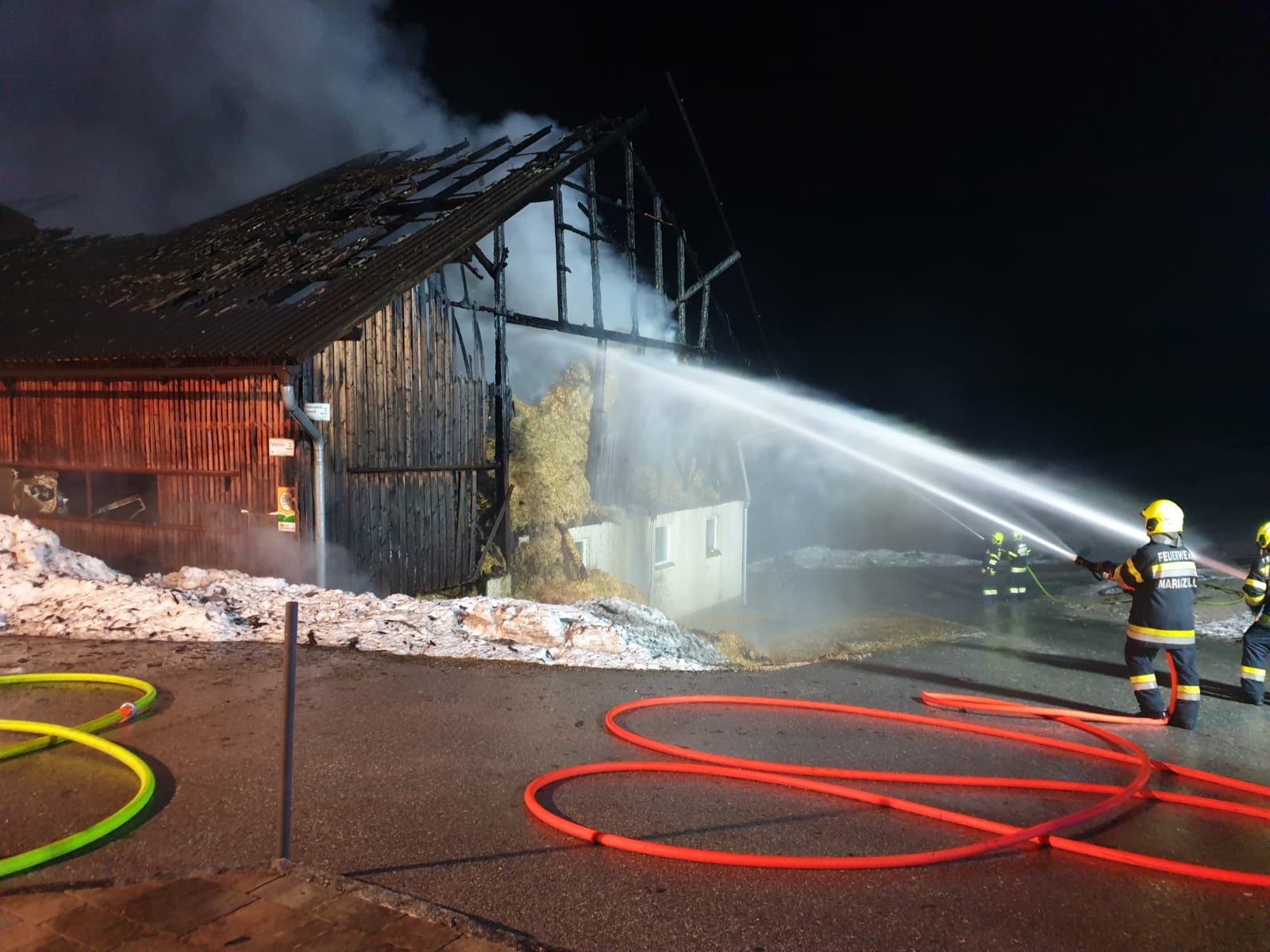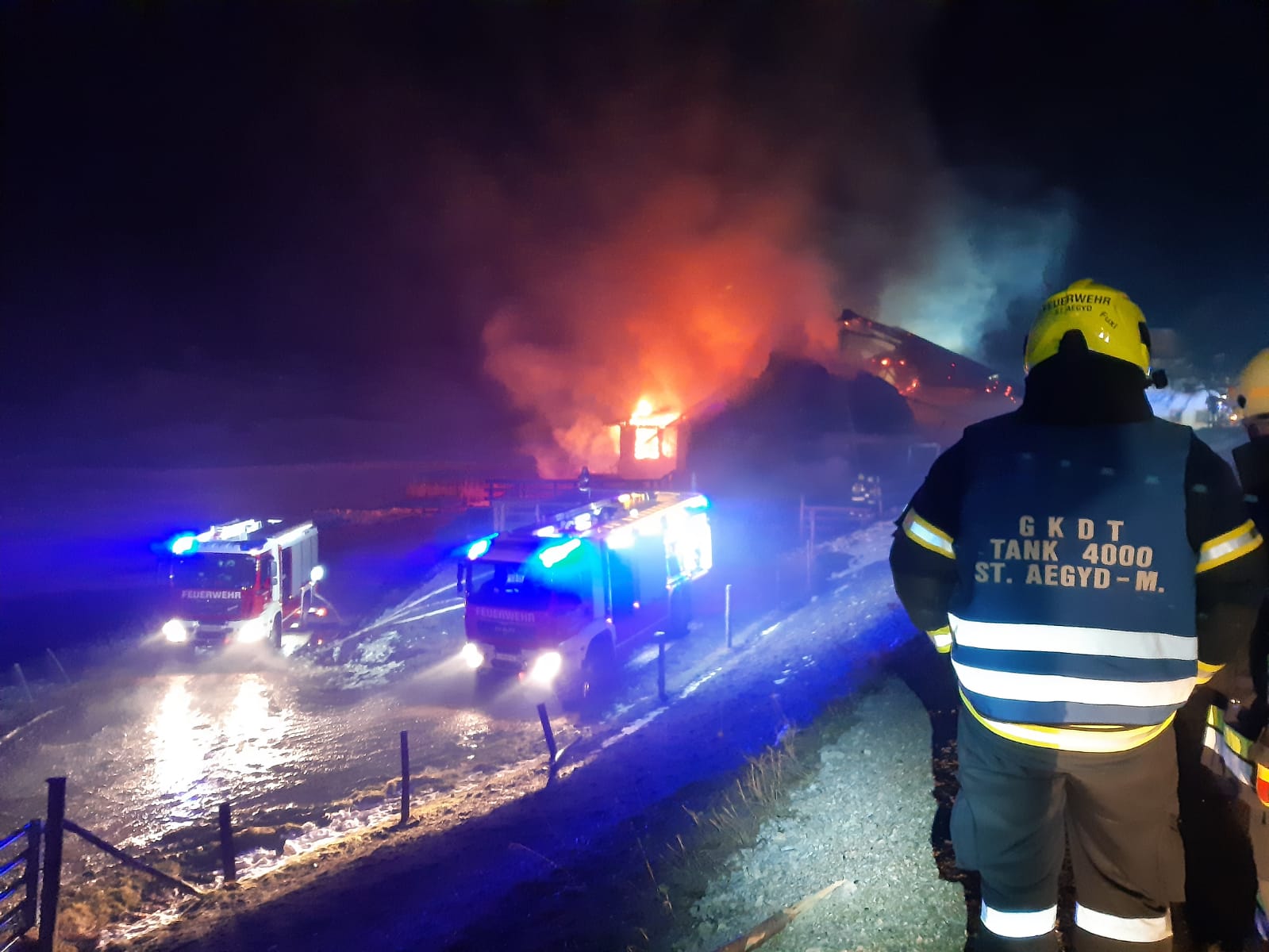 ,,Unterstützung der FF Mariazell bei einem Großbrand in Mooshuben“ lautete die Alarmdurchsage. Umgehend rückten die 2 Tanklöschfahrzeuge der FF St. Aegyd mit 16 Mann zur Einsatzadresse aus. Ein Stallgebäude stand in Vollbrand – Löschwasser wurde dringend benötigt.
