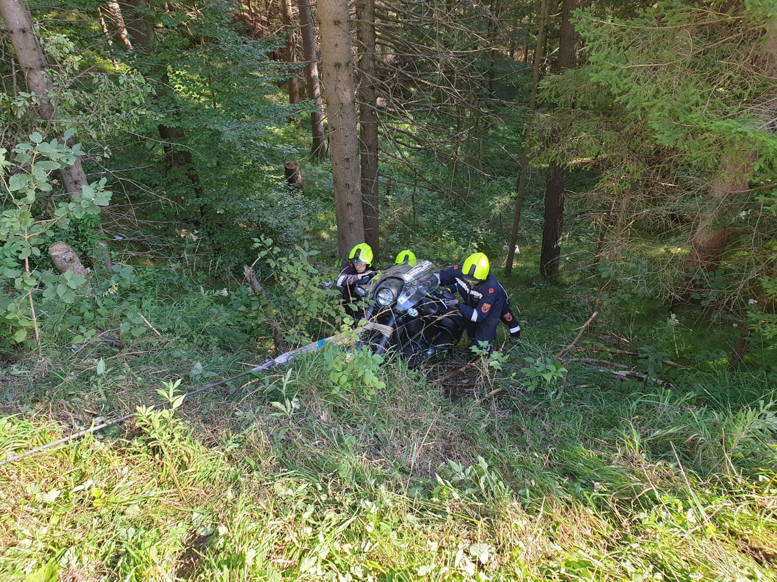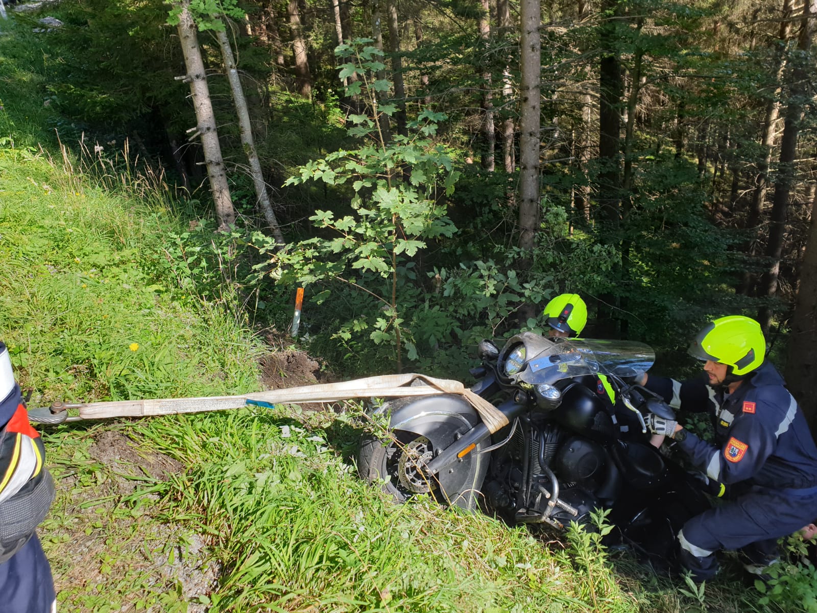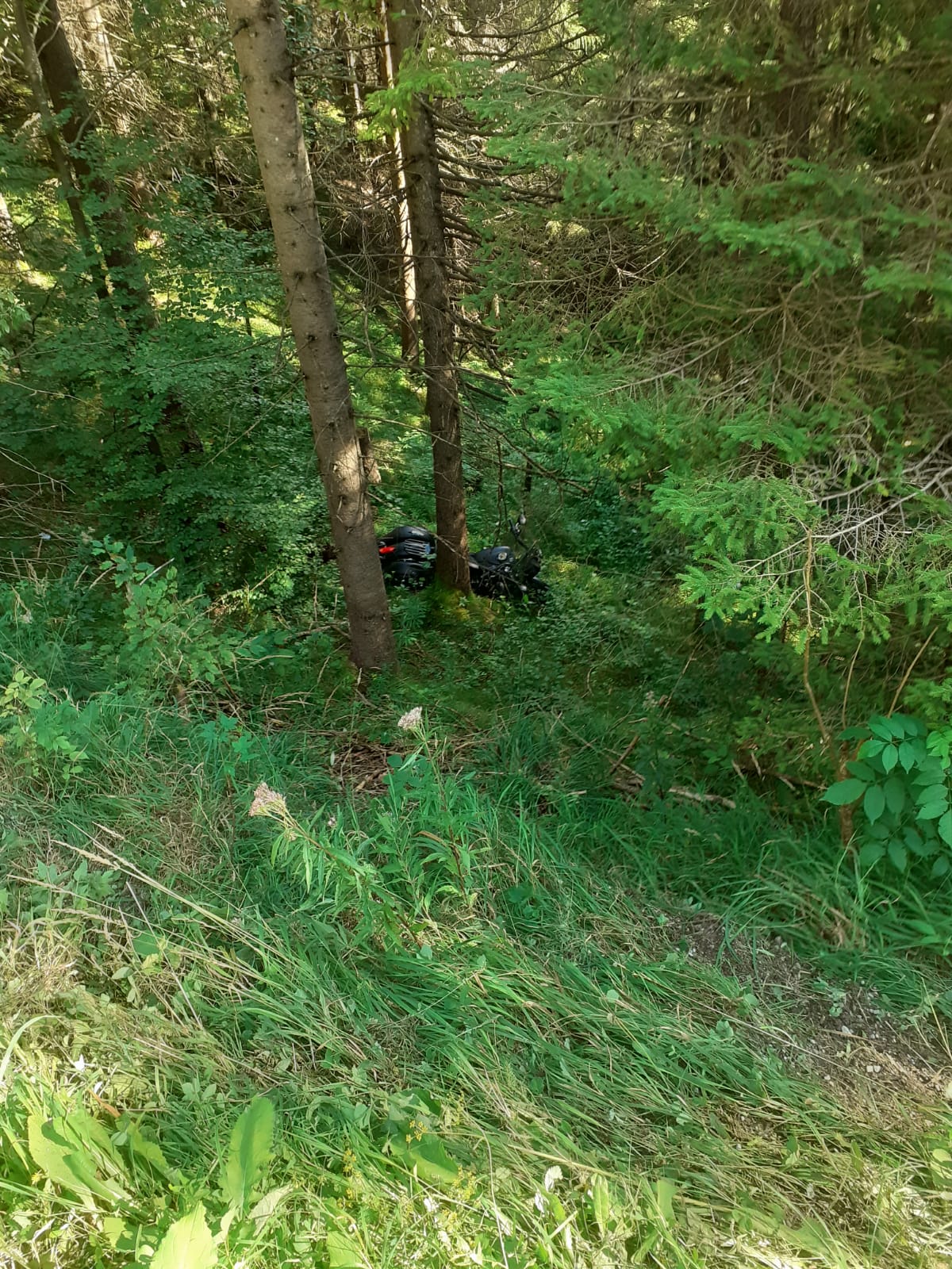 Ein Mann aus dem Bezirk Mödling kam aus unbekannter Ursache mit seinem Zweirad von der Straße ab und stürzte rund 25 Meter in den Wald. Der Fahrer blieb durch einen rechtzeitigen Sprung vom Motorrad unverletzt.