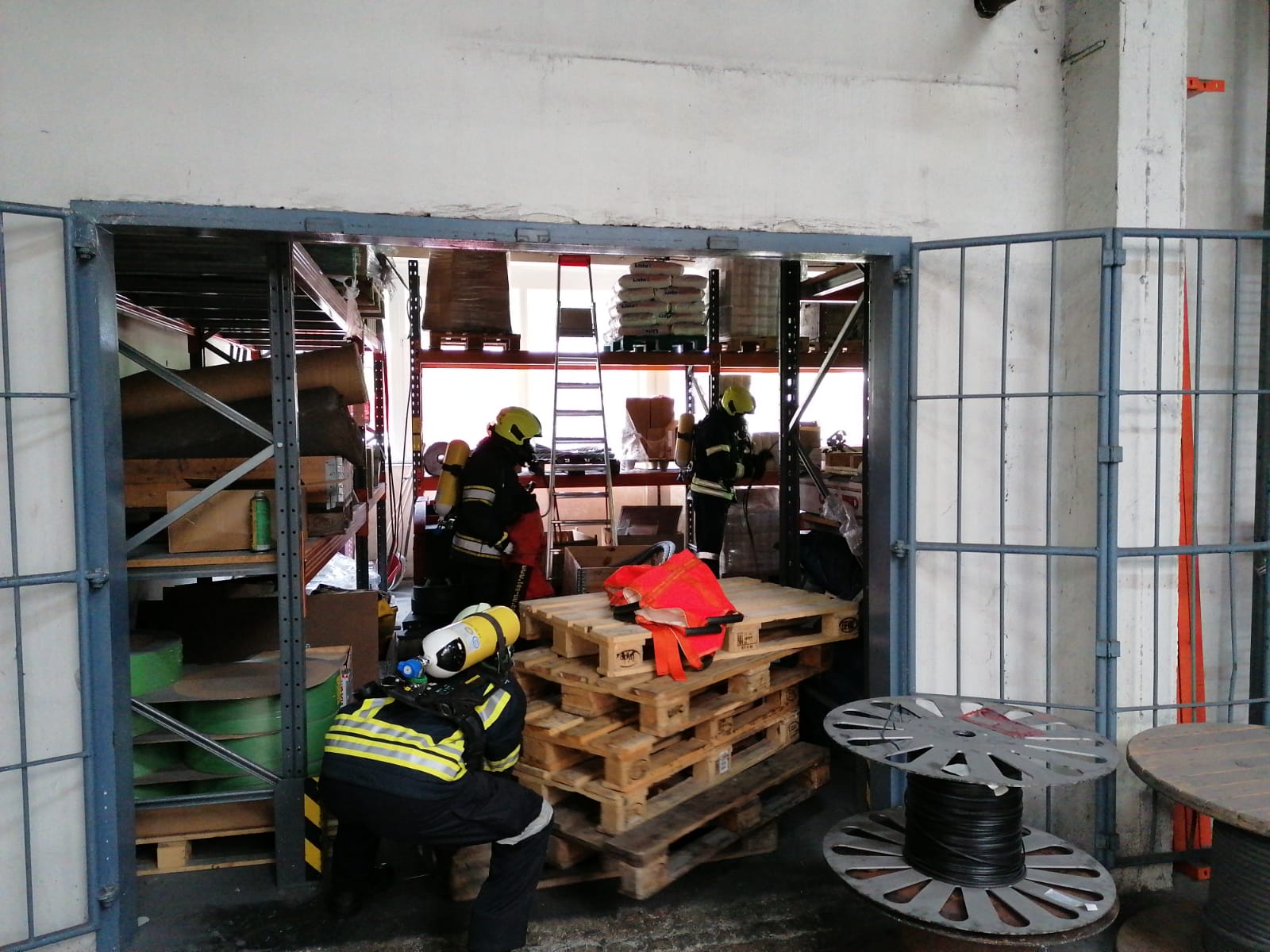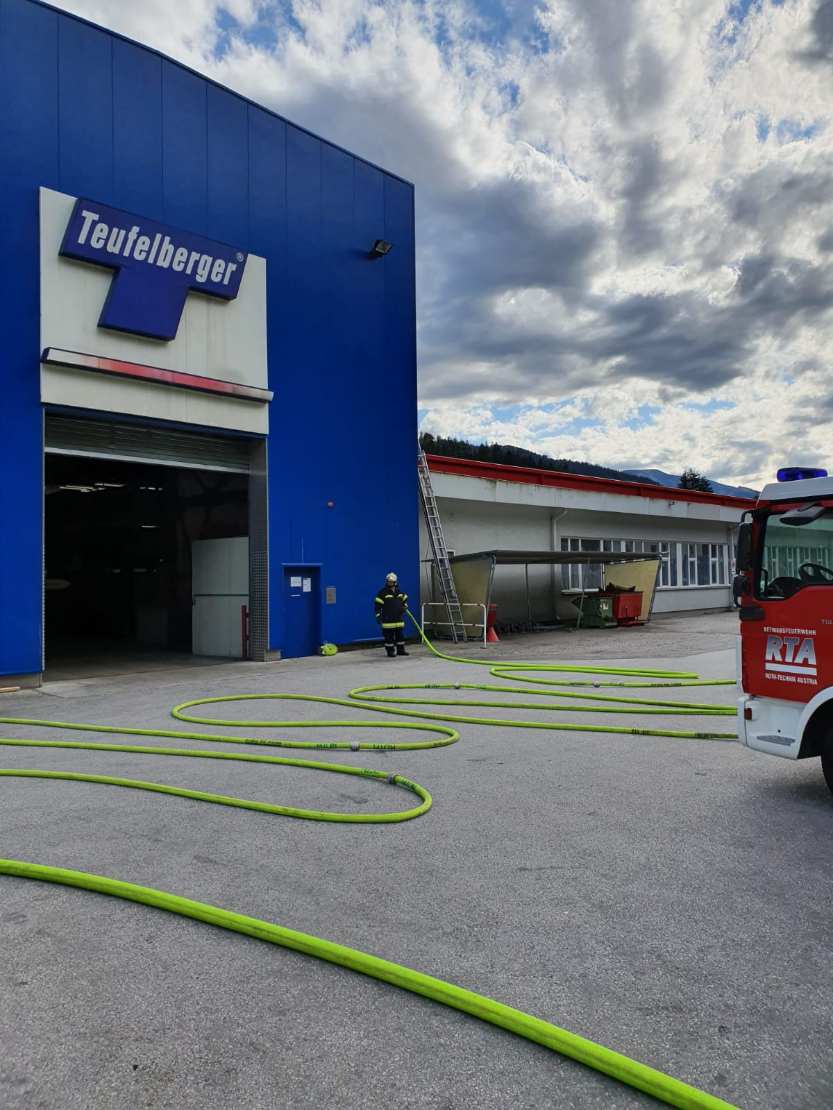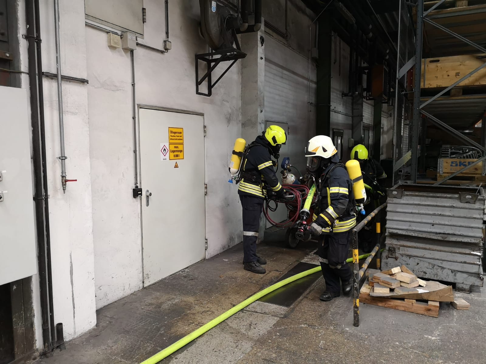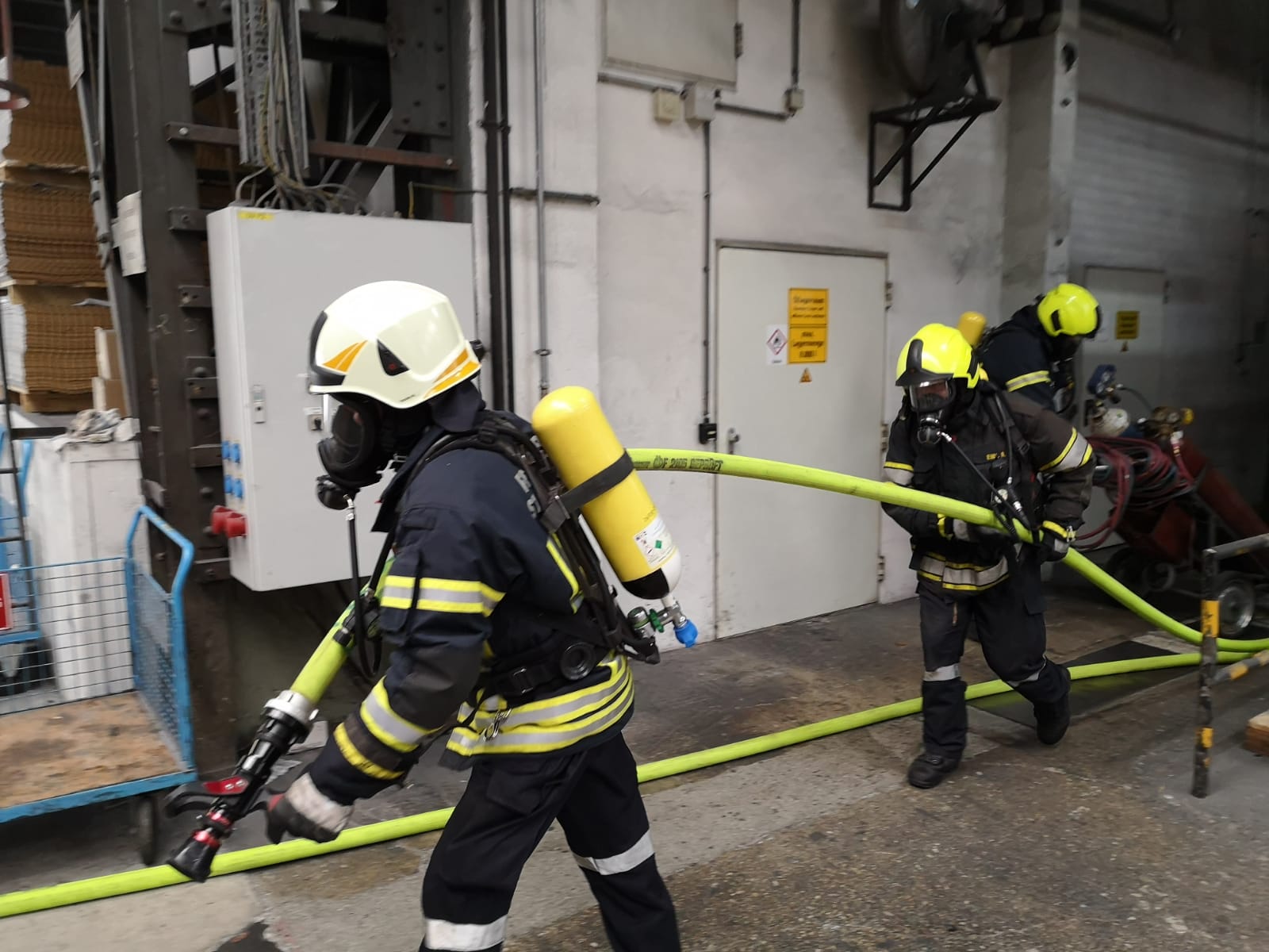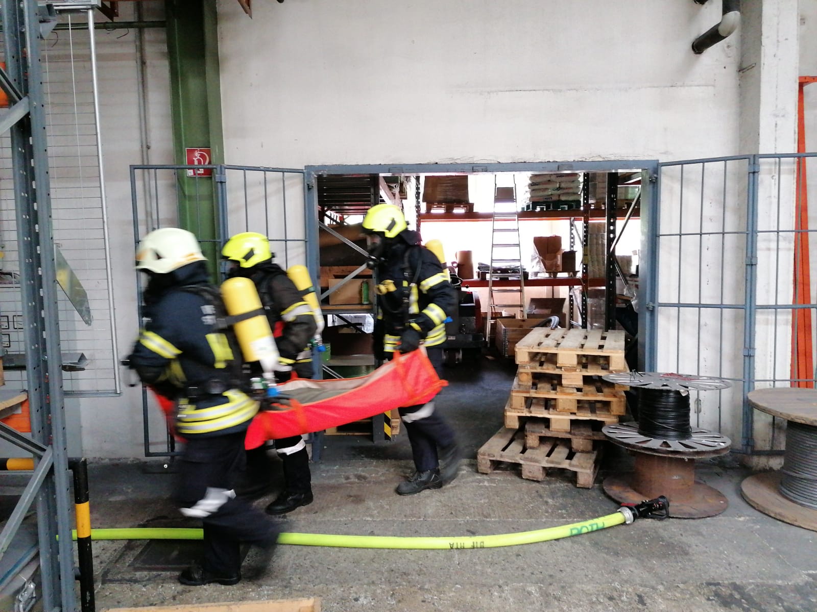 Übungsannahme: Brand durch Schweißarbeiten in einer Lagerhalle mit einer Verletzten Person bei der Firma Teufelberger in St. Aegyd. Mit schweren Atemschutz musste eine ca. 60 Kg. schwere Puppe und eine Azetylen Schweißanlage in Sicherheit gebracht werden.