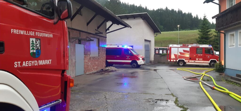 Die FF St. Aegyd stand mit 3 Fahrzeugen und 18 Mann mehrere Stunden im Einsatz. Parallel zum Einsatz in Kernhof wurden in St. Aegyd Kontrollfahrten durchgeführt. Aufgrund einer Verklausung bei einer Wehranlage im Marktbereich trat der Bach kurzzeitig über die Ufer. Diese wurde mit dem Kran entfernt und die Lage entschärft.