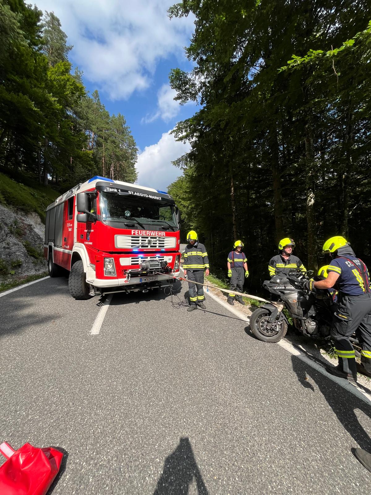 Ein Motorradfahrer aus dem Bezirk Gänserndorf verlor die Kontrolle über sein Zweirad, sprang geistesgegenwärtig ab, ehe das Motorrad gegen einen Baum prallte. Der Fahrer wurde durch den Rettungsdienst versorgt und ins Krankenhaus transportiert. Die Feuerwehr St. Aegyd führte die Fahrzeugbergung durch.