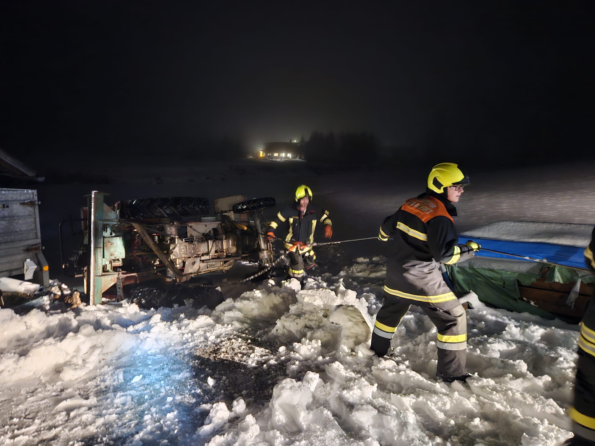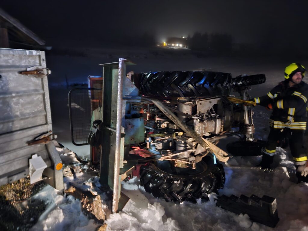 Beim Schneeräumen stürzte ein Traktor um, der Fahrer konnte sich selbst befreien und verständigte den Notruf. Der Traktor wurde mit der Seilwinde von Tank 1 wieder aufgestellt und auf festem Untergrund zurück gezogen.