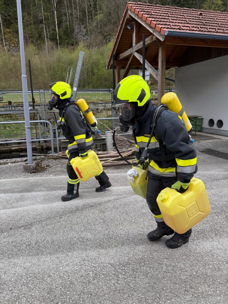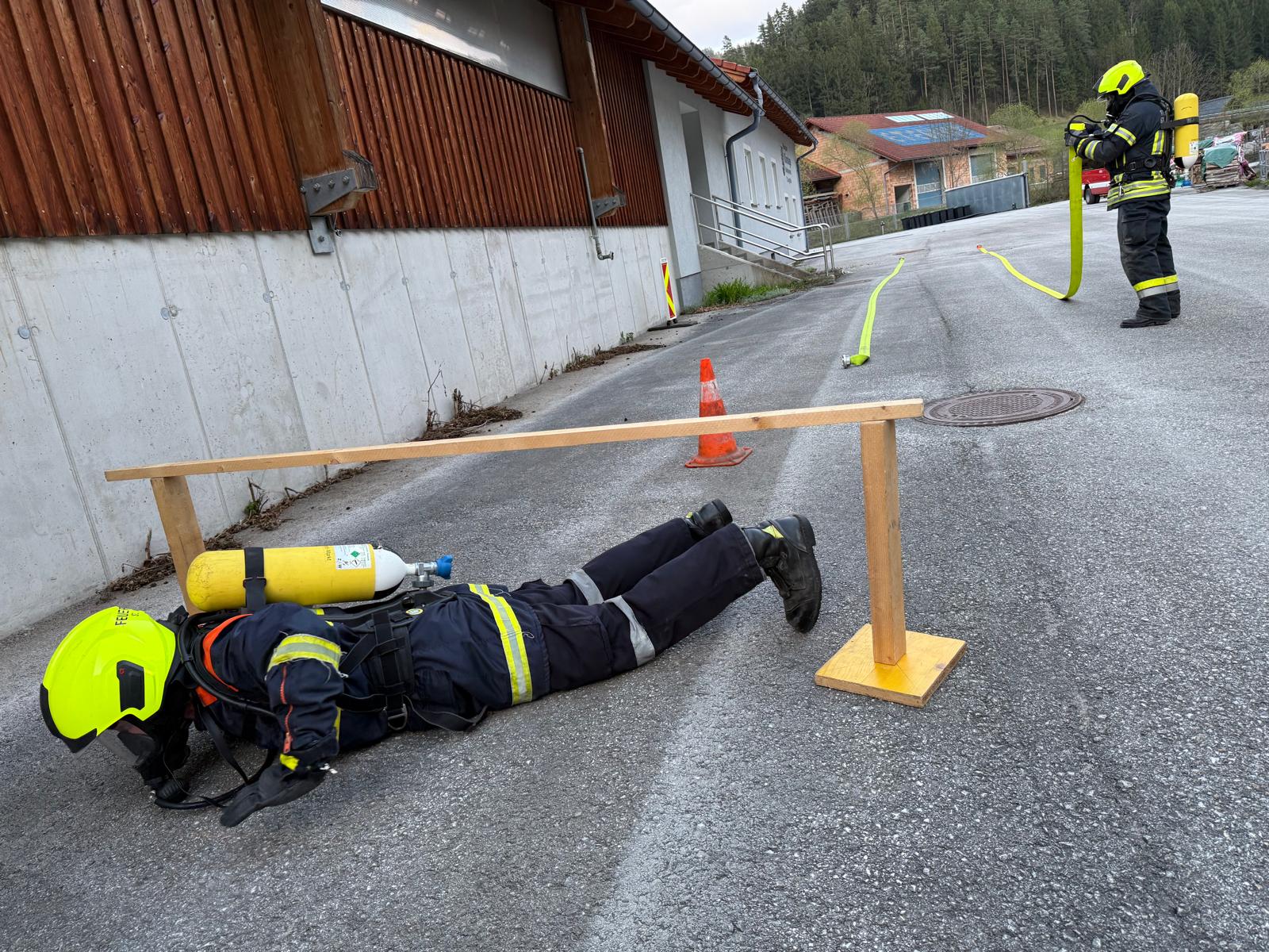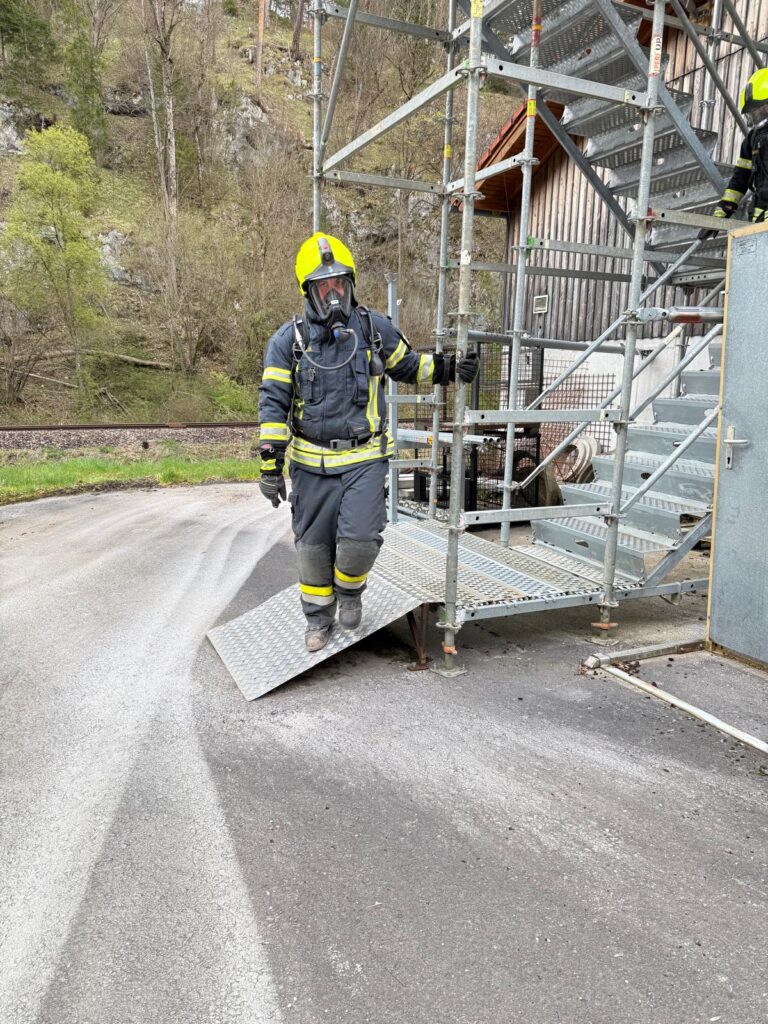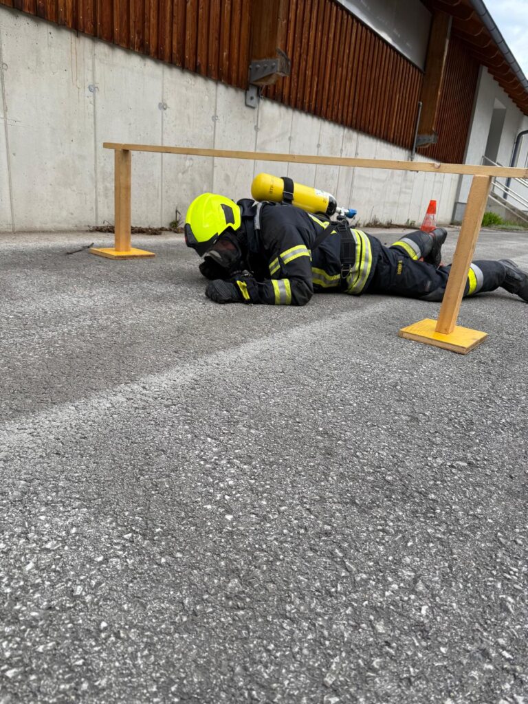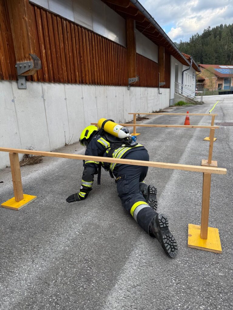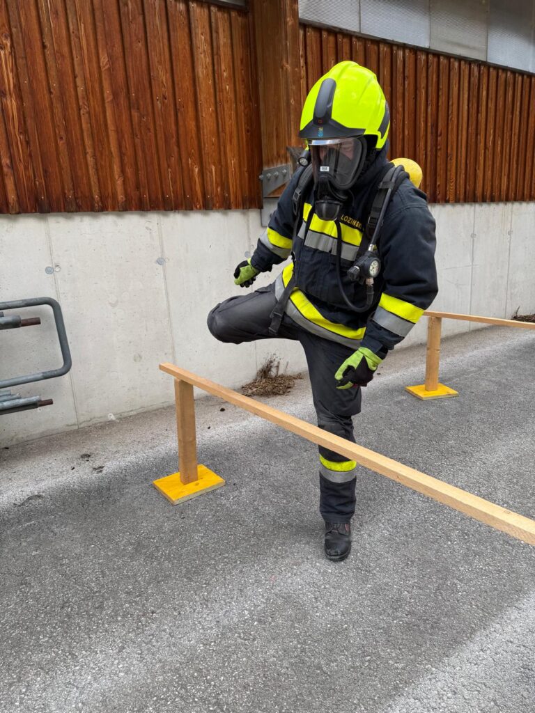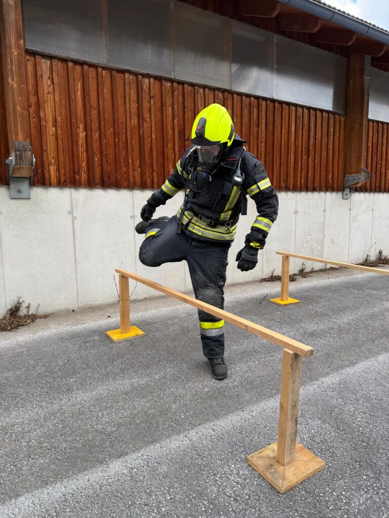 Die Überprüfung wurde am Trainingsgelände bei der St. Aegyder Kläranlage durchgeführt. Beim sogenannten Finnentest müssen 5 Stationen in einer Zeit von 14,5 min mit voller Einsatzbekleidung und Atemschutzausrüstung bewältigt werden.