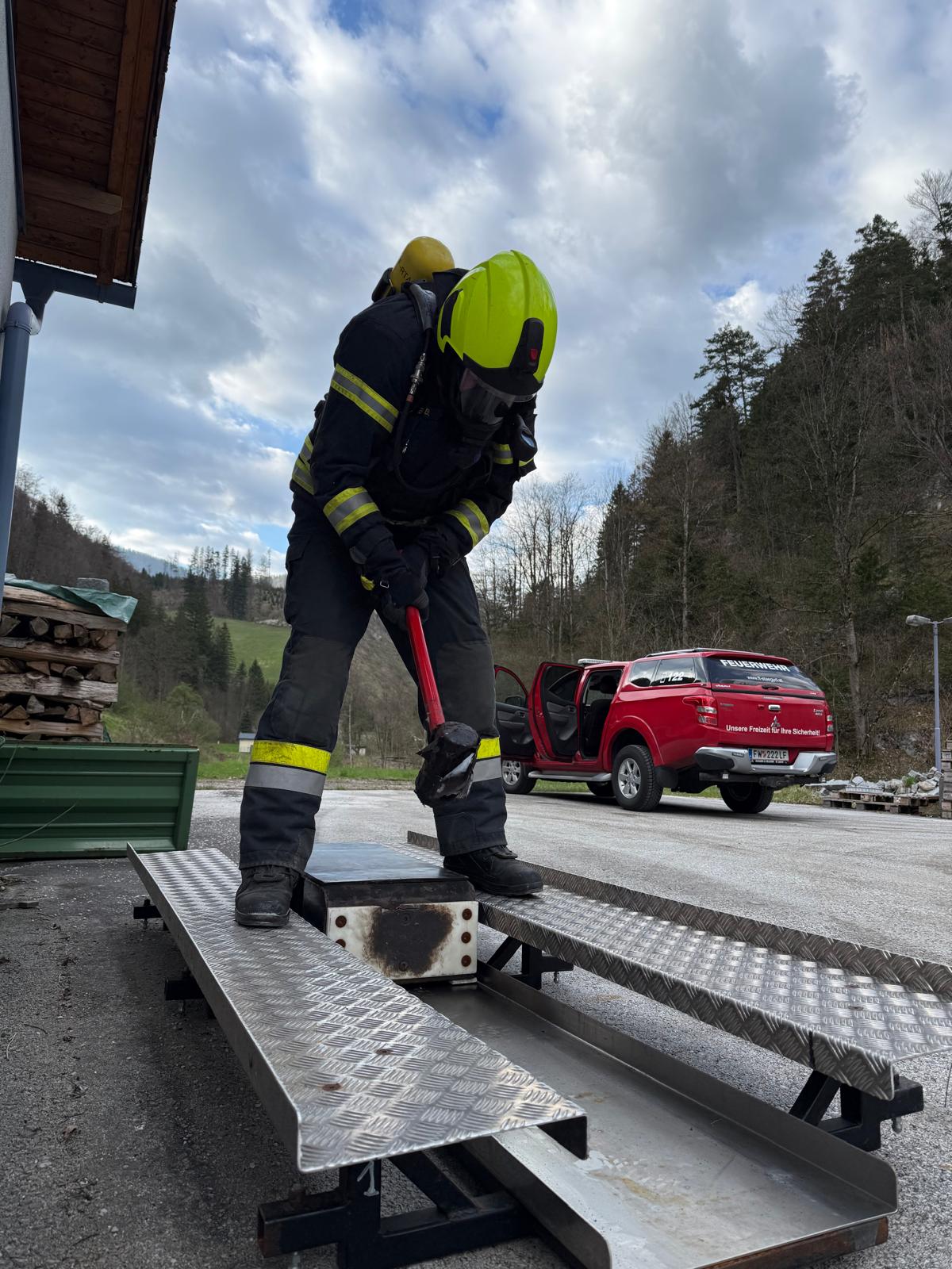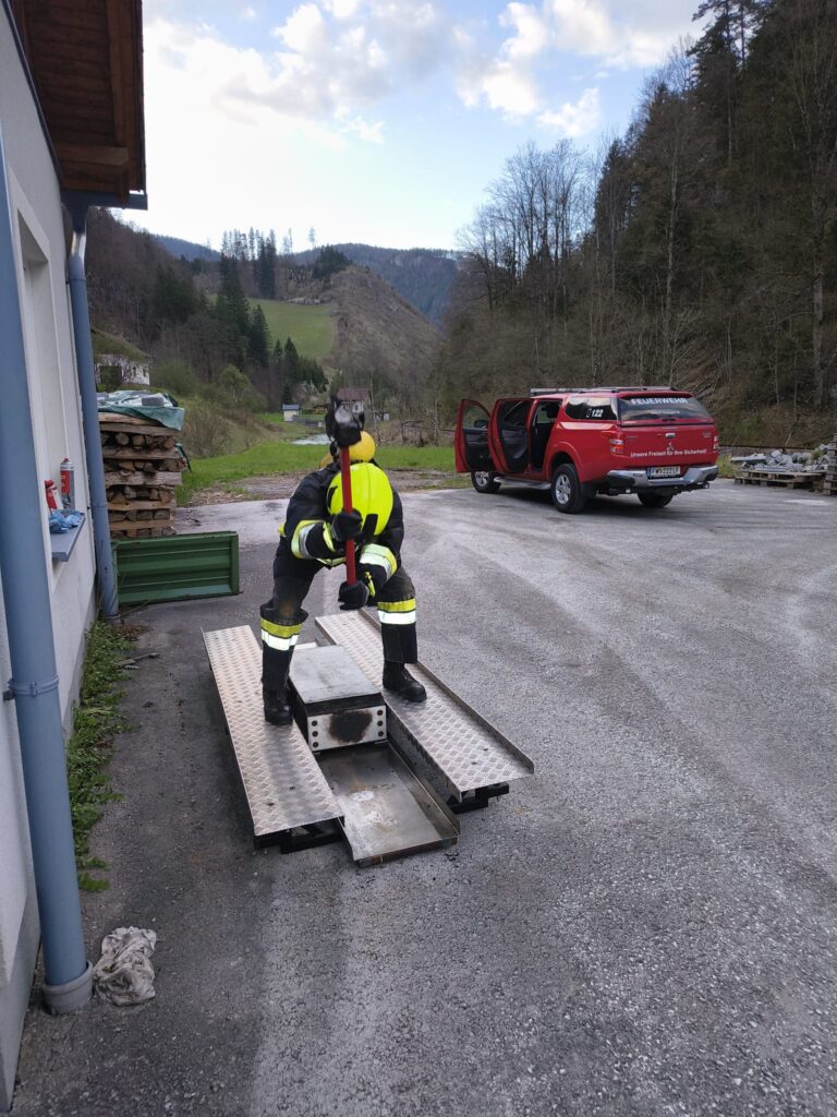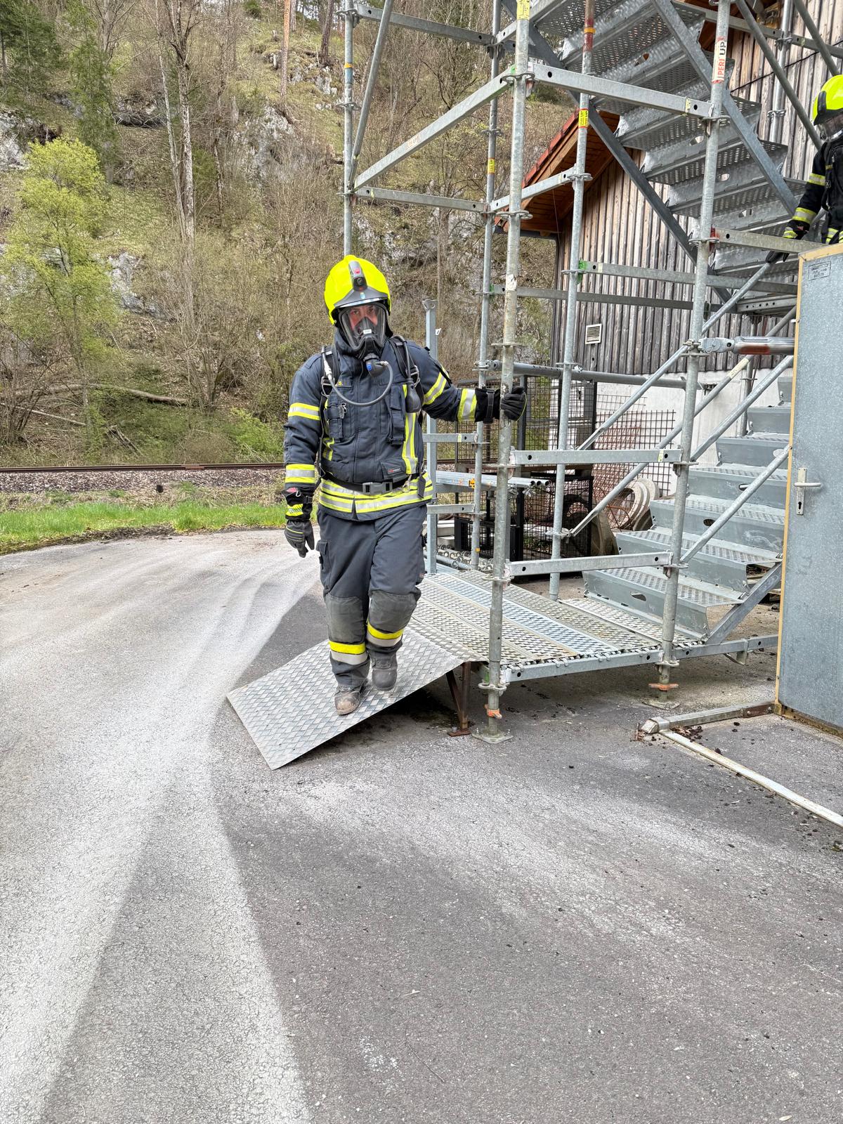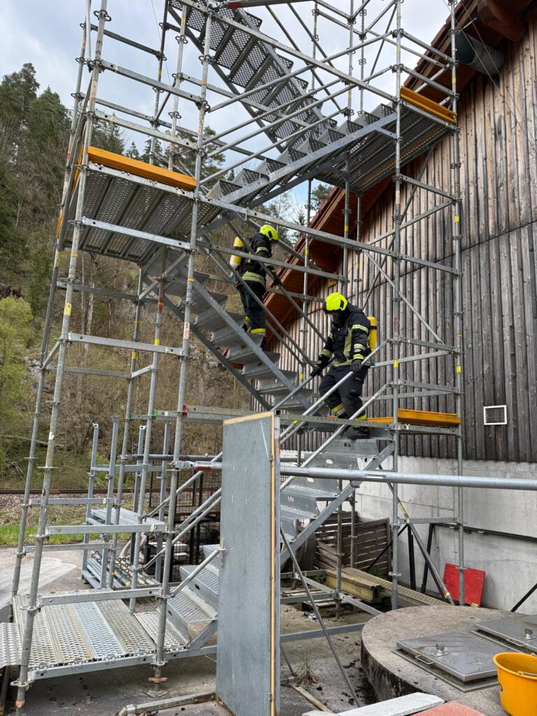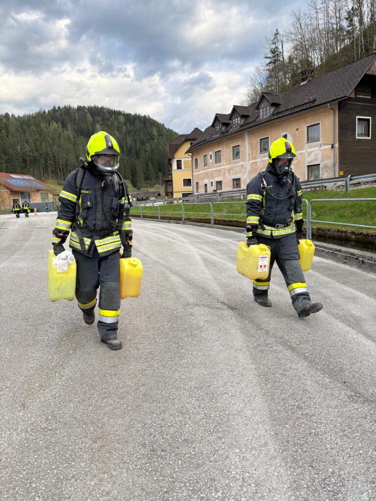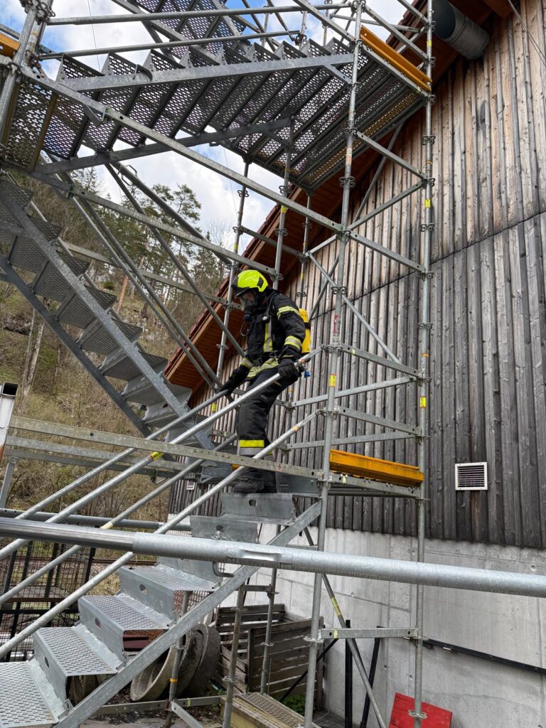 Die Überprüfung wurde am Trainingsgelände bei der St. Aegyder Kläranlage durchgeführt. Beim sogenannten Finnentest müssen 5 Stationen in einer Zeit von 14,5 min mit voller Einsatzbekleidung und Atemschutzausrüstung bewältigt werden.