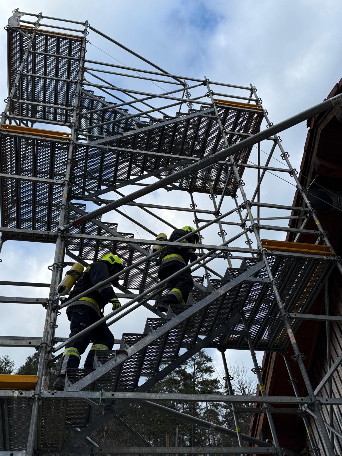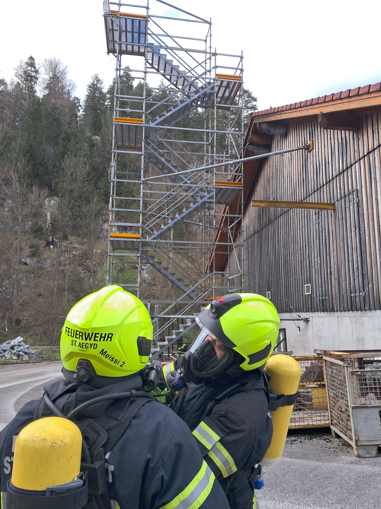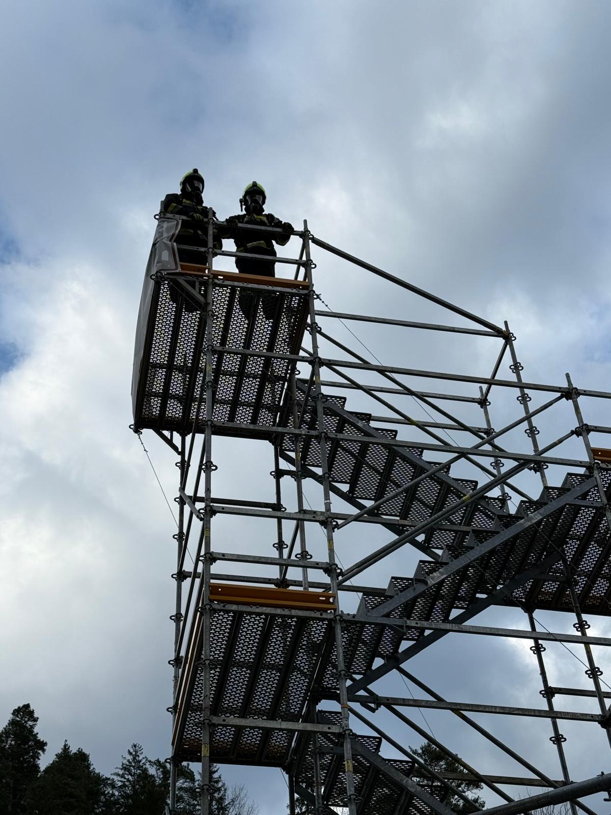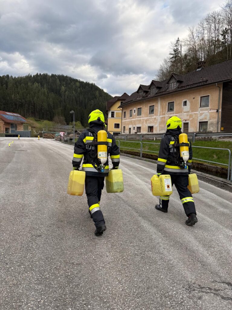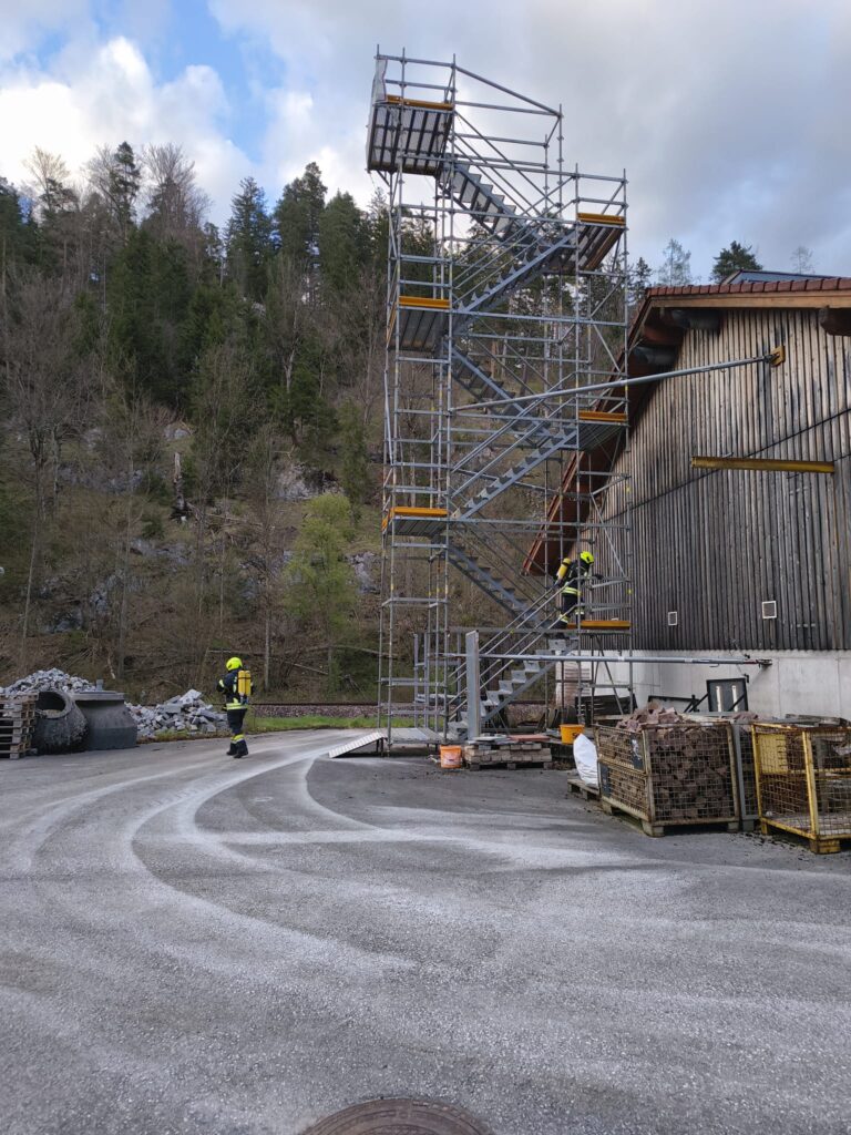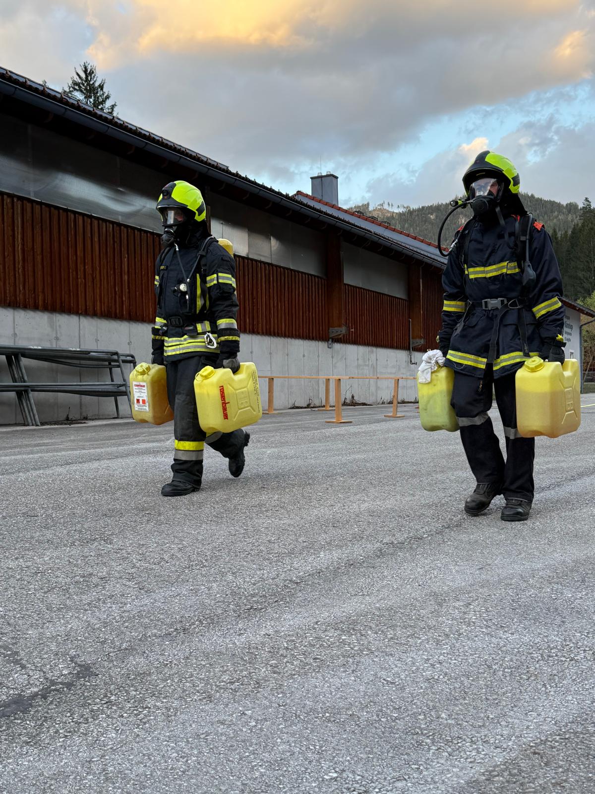 Die Überprüfung wurde am Trainingsgelände bei der St. Aegyder Kläranlage durchgeführt. Beim sogenannten Finnentest müssen 5 Stationen in einer Zeit von 14,5 min mit voller Einsatzbekleidung und Atemschutzausrüstung bewältigt werden.